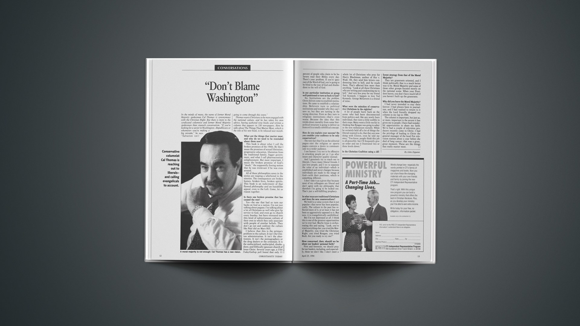 In the minds of many, the name of former Moral Majority spokesman Cal Thomas is synonymous with the Christian Right. But there is more to the syndicated columnist and former Moral Majority spokesman than staunch conservatism. “If you’re looking for a savior in Washington—Republicans or whomever—you’re making a big mistake,” he says. “Salvation isn’t going to come through this town.”