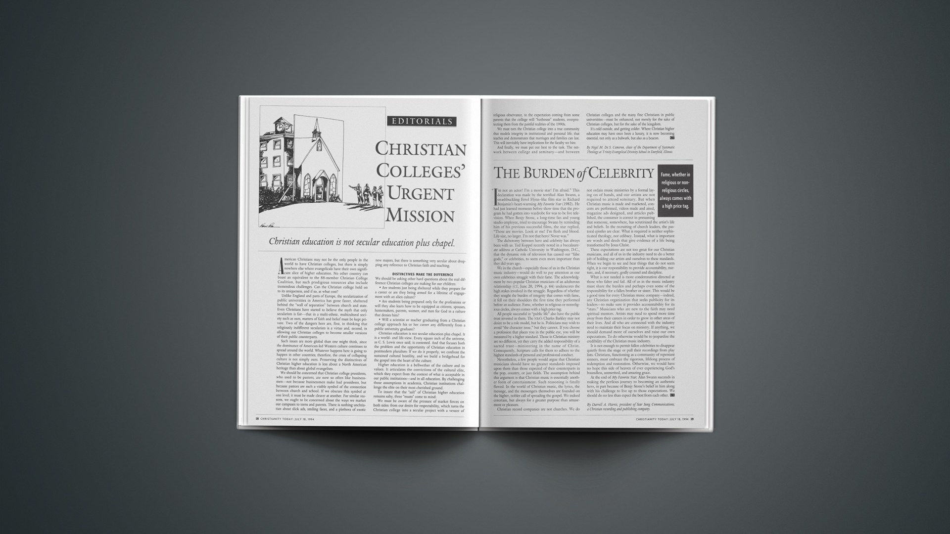 We in the church—especially those of us in the Christian music industry—would do well to pay attention as our own celebrities struggle with their fame. The acknowledgment by two popular Christian musicians of an adulterous relationship (CT, June 20, 1994, p. 64) underscores the high stakes involved in the struggle. Regardless of whether they sought the burden of integrity that comes with fame, it fell on their shoulders the first time they performed before an audience. Fame, whether in religious or nonreligious circles, always comes with a high price tag.