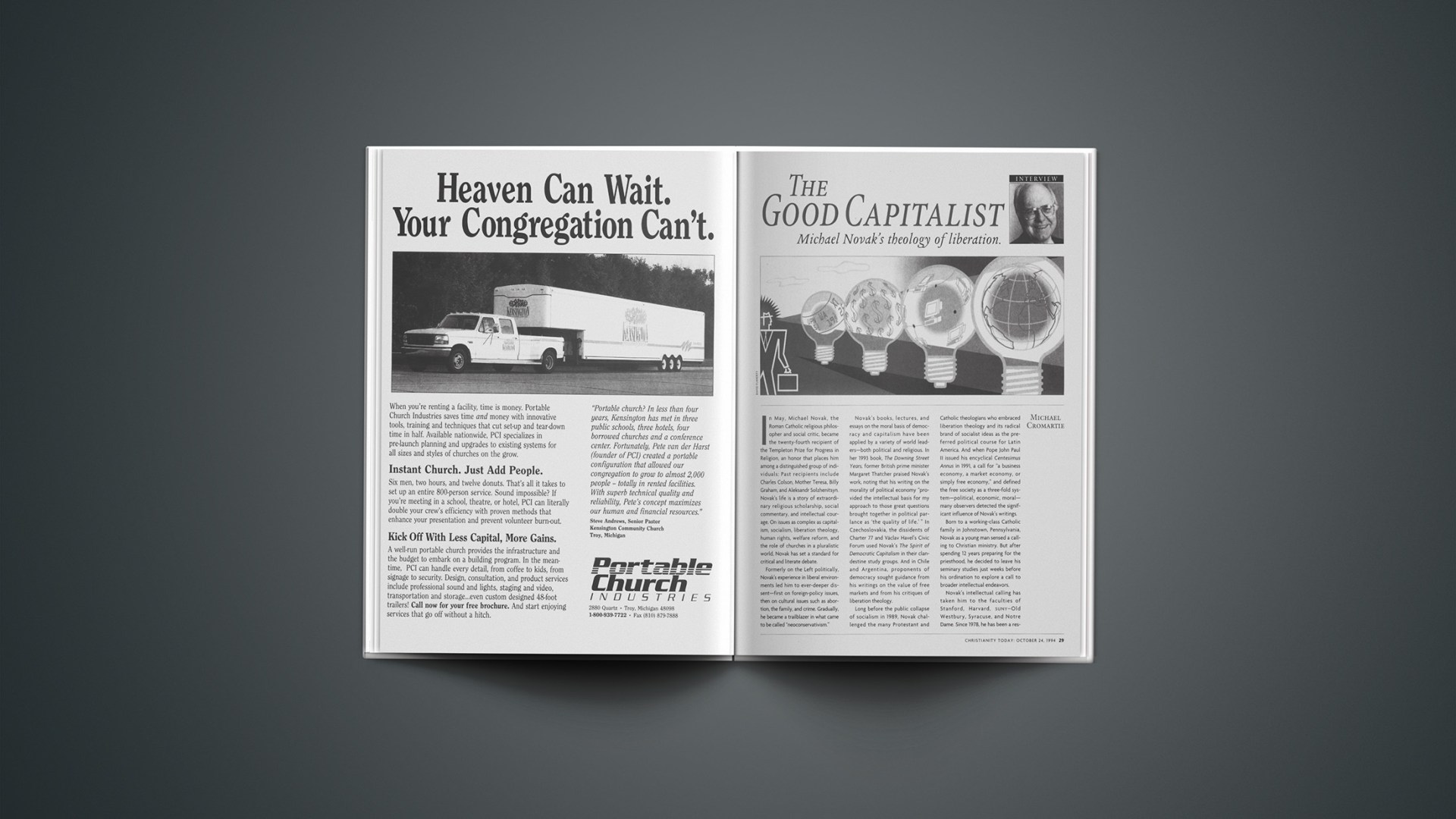 In May, Michael Novak, the Roman Catholic religious philosopher and social critic, became the twenty-fourth recipient of the Templeton Prize for Progress in Religion, an honor that places him among a distinguished group of individuals: Past recipients include Charles Colson, Mother Teresa, Billy Graham, and Aleksandr Solzhenitsyn. Novak’s life is a story of extraordinary religious scholarship, social commentary, and intellectual courage. On issues as complex as capitalism, socialism, liberation theology, human rights, welfare reform, and the role of churches in a pluralistic world, Novak has set a standard for critical and literate debate.
