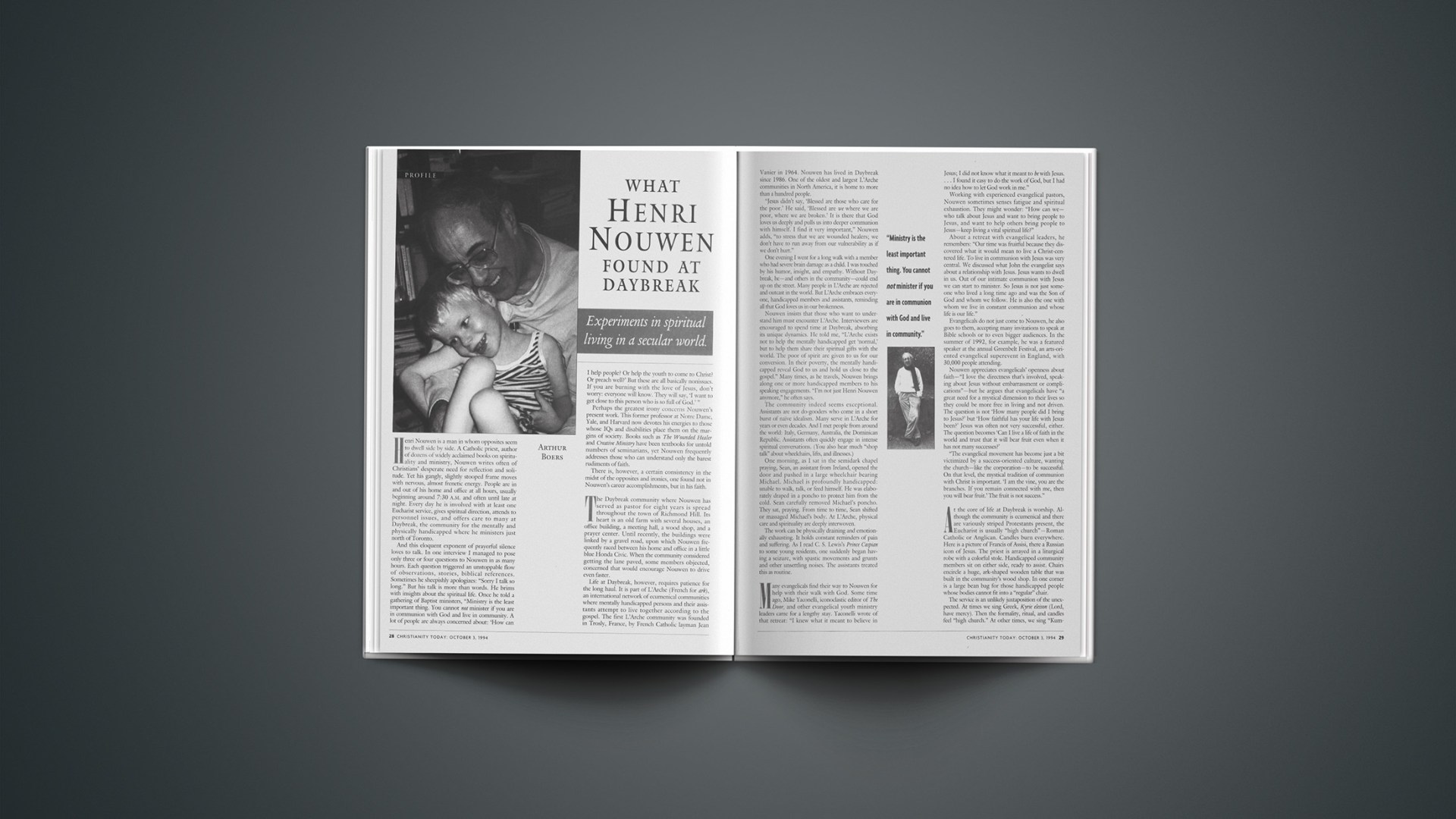 Henri Nouwen is a man in whom opposites seem to dwell side by side. A Catholic priest, author of dozens of widely acclaimed books on spirituality and ministry, Nouwen writes often of Christians’ desperate need for reflection and solitude. Yet his gangly, slightly stooped frame moves with nervous, almost frenetic energy. People are in and out of his home and office at all hours, usually beginning around 7:30 A.M. and often until late at night. Every day he is involved with at least one Eucharist service, gives spiritual direction, attends to personnel issues, and offers care to many at Daybreak, the community for the mentally and physically handicapped where he ministers just north of Toronto.