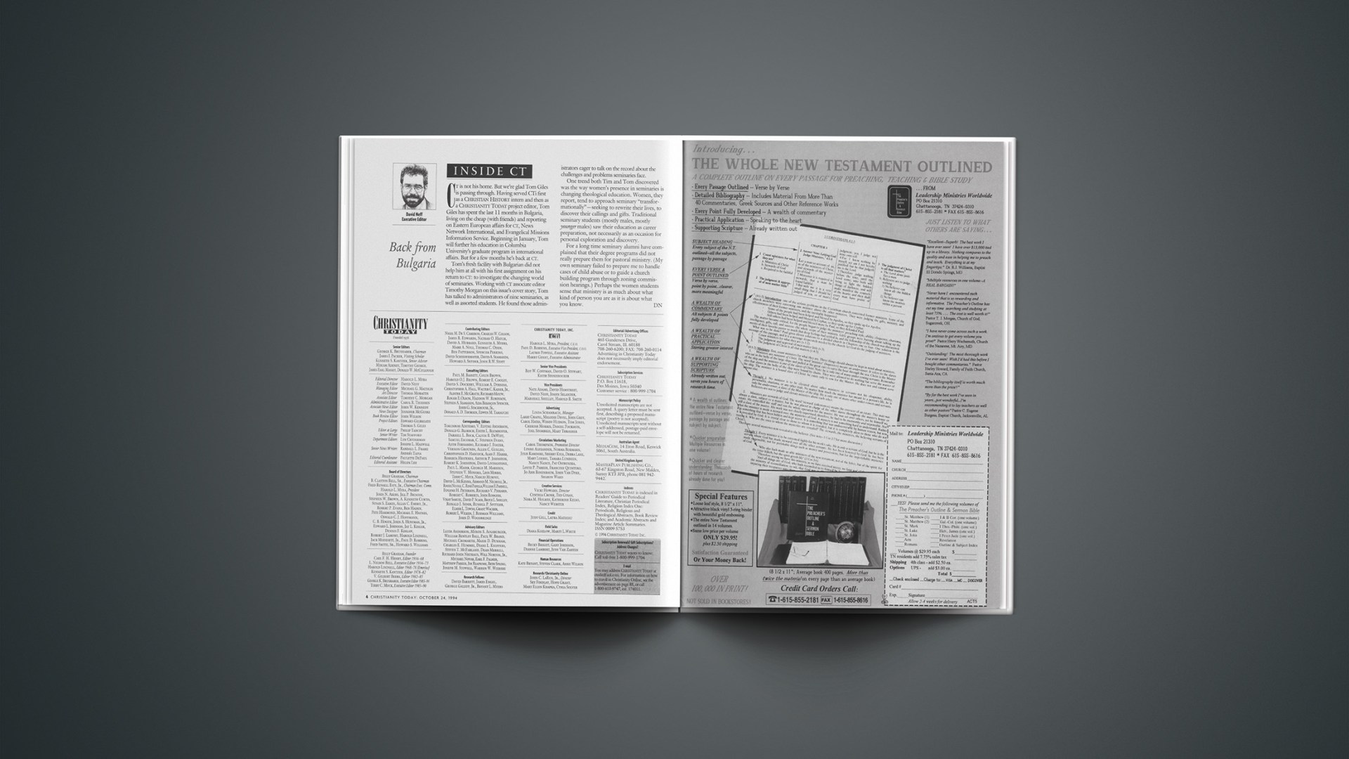 Tom’s fresh facility with Bulgarian did not help him at all with his first assignment on his return to CT: to investigate the changing world of seminaries. Working with CT associate editor Timothy Morgan on this issue’s cover story, Tom has talked to administrators of nine seminaries, as well as assorted students. He found those administrators eager to talk on the record about the challenges and problems seminaries face.