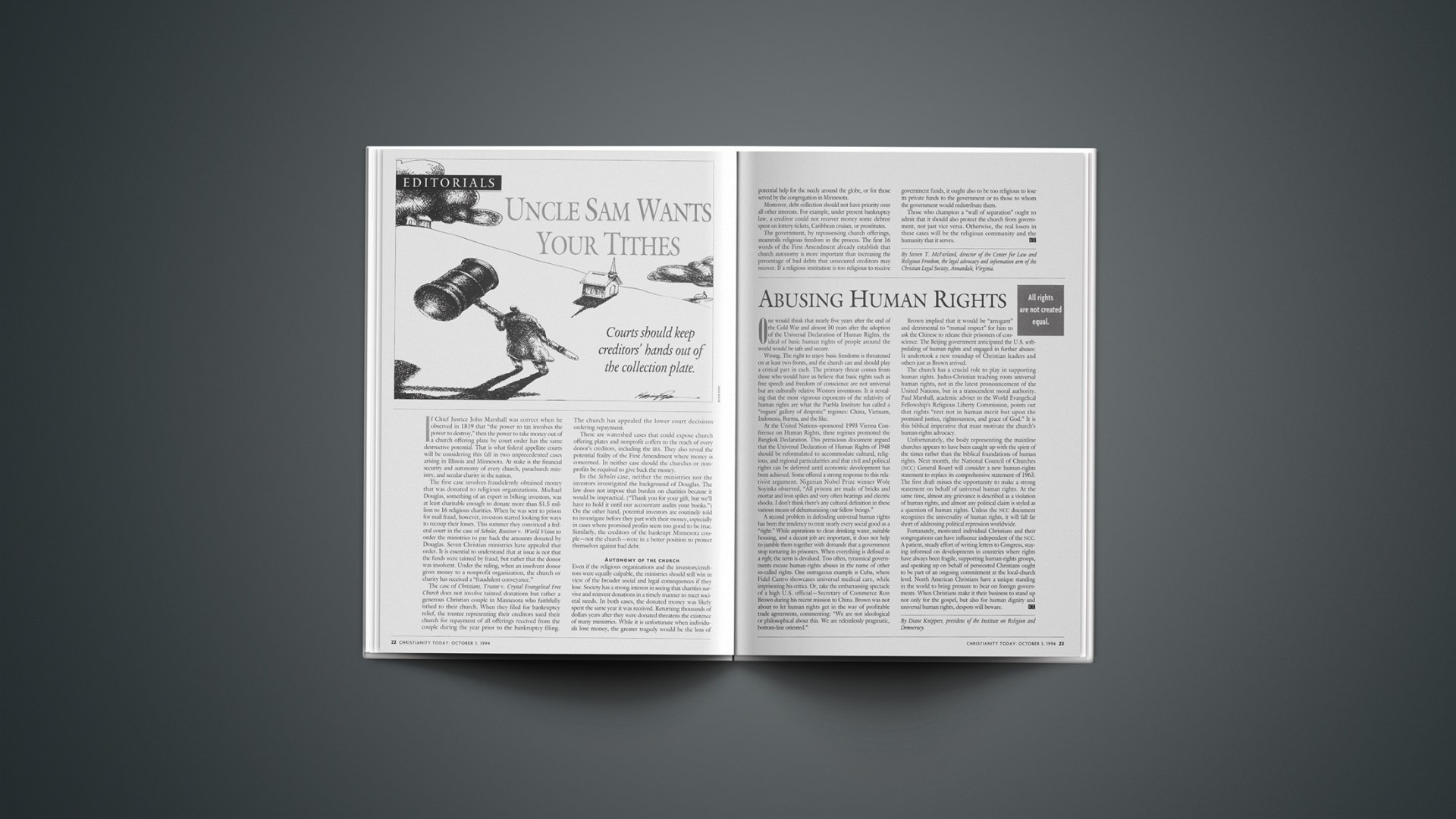 The church has a crucial role to play in supporting human rights. Judeo-Christian teaching roots universal human rights, not in the latest pronouncement of the United Nations, but in a transcendent moral authority. Paul Marshall, academic adviser to the World Evangelical Fellowship’s Religious Liberty Commission, points out that rights “rest not in human merit but upon the promised justice, righteousness, and grace of God.” It is this biblical imperative that must motivate the church’s human-rights advocacy.