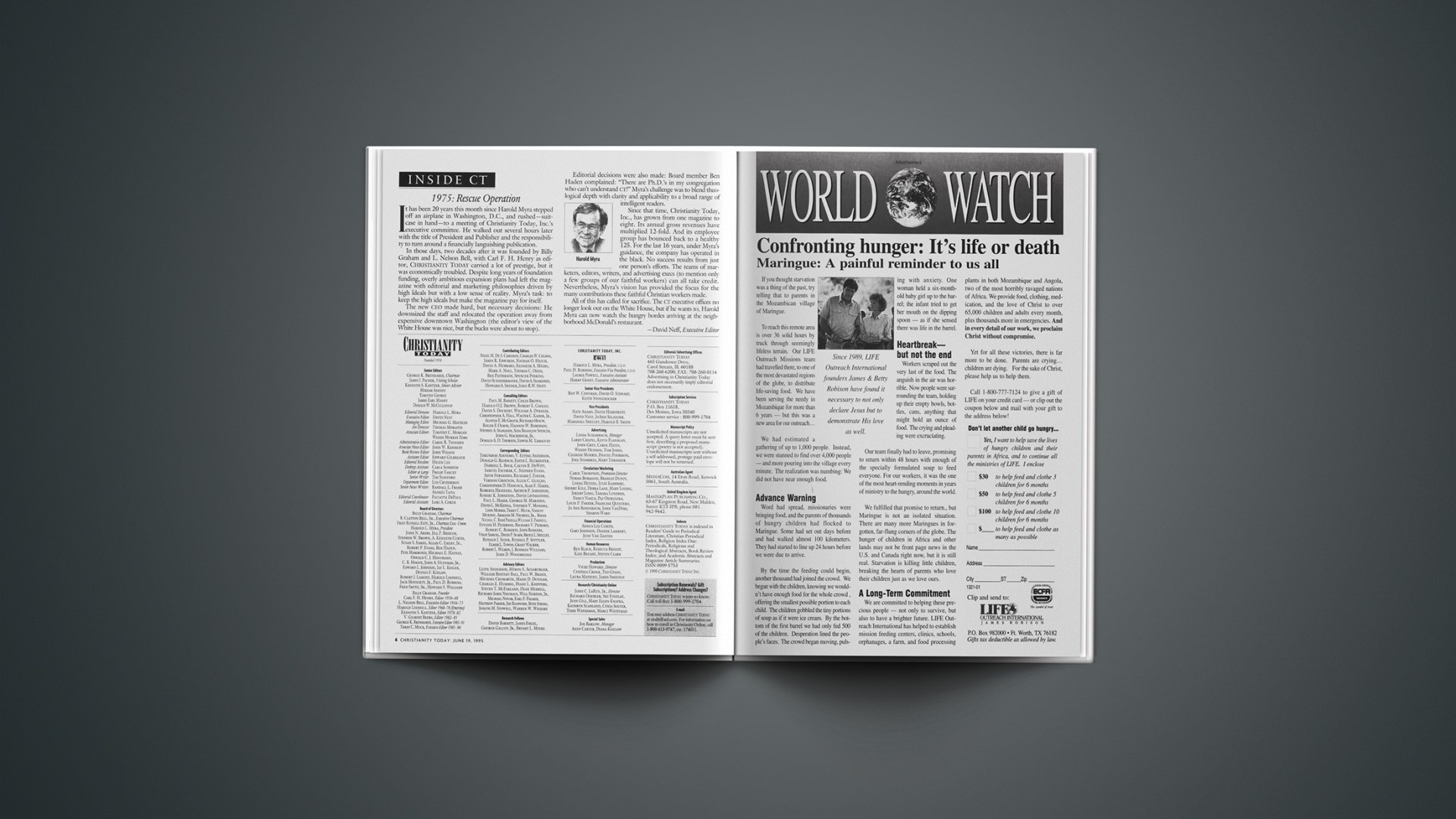 It has been 20 years this month since Harold Myra stepped off an airplane in Washington, D.C., and rushed-suitcase in hand-to a meeting of Christianity Today, Inc.’s executive committee. He walked out several hours later with the title of President and Publisher and the responsibility to turn around a financially languishing publication.