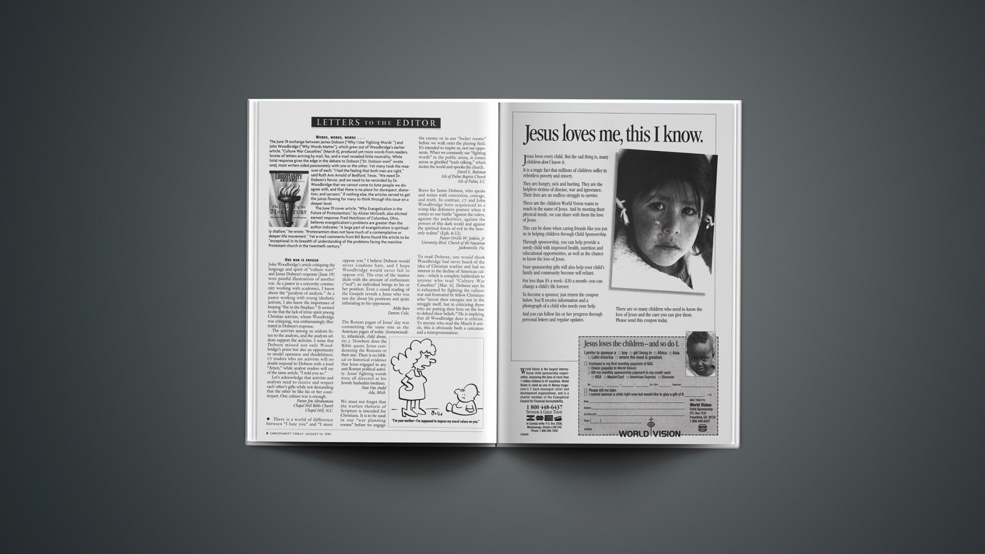 The June 19 exchange between James Dobson (“Why I Use ‘Fighting Words’ “) and John Woodbridge (“Why Words Matter”), which grew out of Woodbridge’s earlier article, “Culture War Casualties” (March 6), produced yet more words from readers. Scores of letters arriving by mail, fax, and e-mail revealed little neutrality. While total response gives the edge in the debate to Dobson (“Dr. Dobson won!” wrote one), most writers sided passionately with one or the other. Yet many took the measure of each: “I had the feeling that both men are right,” said Ruth Ann Arnold of Bedford, Texas. “We need Dr. Dobson’s fervor, and we need to be reminded by Dr. Woodbridge that we cannot come to hate people we disagree with, and that there is no place for disrespect, distortion, and sarcasm.” If nothing else, the articles served to get the juices flowing for many to think through this issue on a deeper level.