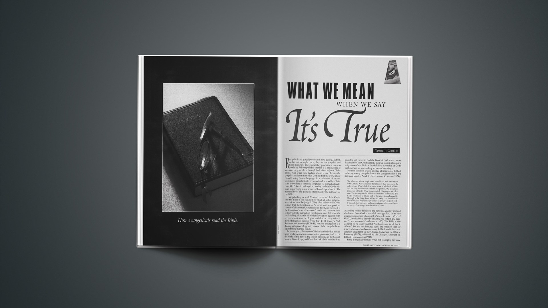 According to this definition, the Bible is a divinely inspired disclosure from God, a revealed message that, in its very givenness, is noninterchangeable (“the only written Word of God”), irreducible (“the only infallible rule of faith and practice”), and universal (“addressed to all”). The Bible is also declared to be totally truthful, “without error in all that it affirms.” For the past hundred years, the common term for total truthfulness has been inerrancy. Biblical truthfulness was carefully elucidated in the Chicago Statement on Biblical Inerrancy (1978), followed by the Chicago Statement on Biblical Hermeneutics (1982).