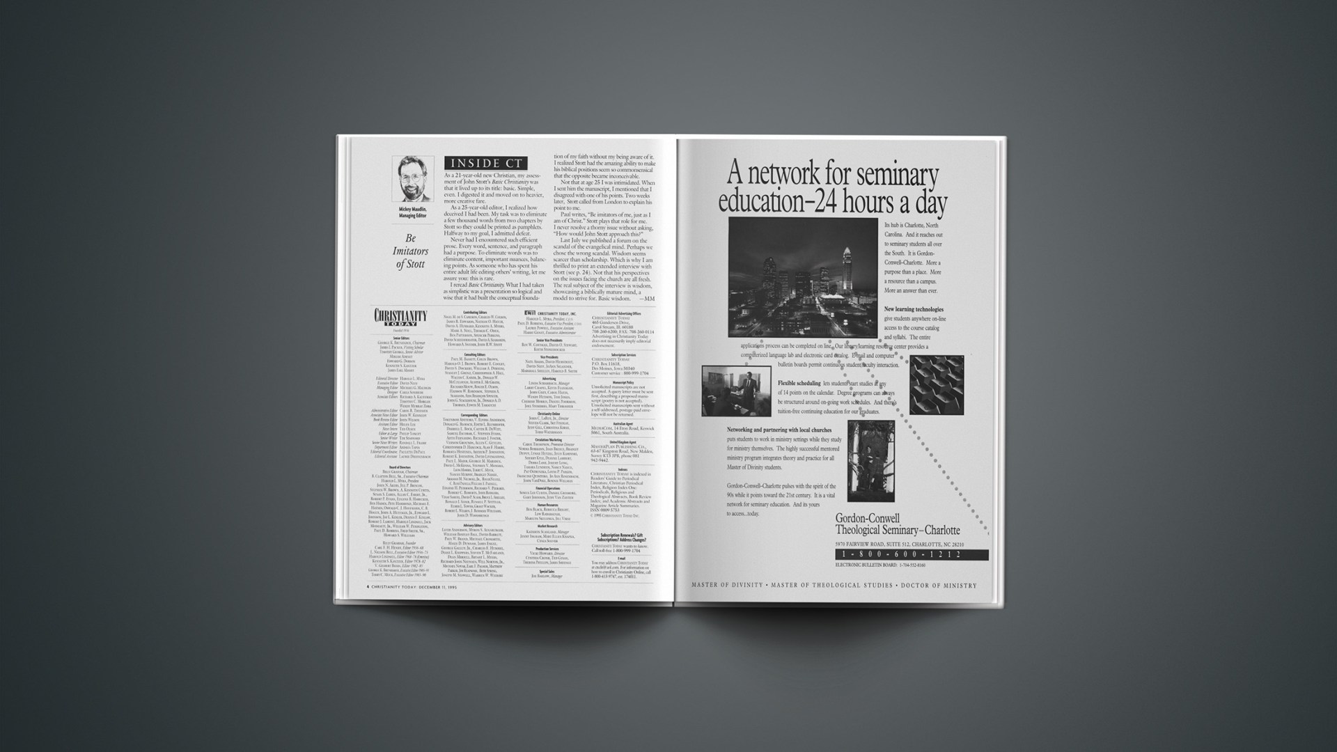 Last July we published a forum on the scandal of the evangelical mind. Perhaps we chose the wrong scandal. Wisdom seems scarcer than scholarship. Which is why I am thrilled to print an extended interview with Stott (in this issue). Not that his perspectives on the issues facing the church are all fresh. The real subject of the interview is wisdom, showcasing a biblically mature mind, a model to strive for. Basic wisdom.