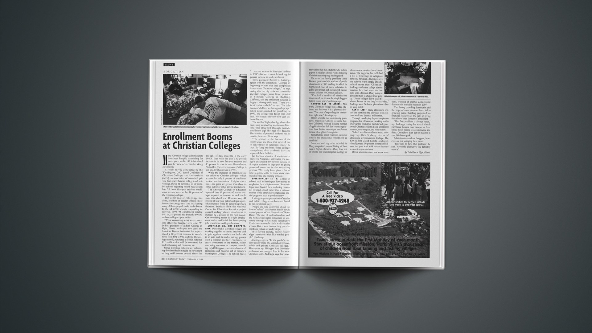 Cccu president Robert C. Andringa agrees with the assessment. “Colleges are beginning to learn that their competition is not other Christian colleges,” he says, noting that the big rivals are community and state colleges. James Grant, president of Simpson College in Redding, California, sees the enrollment increases as largely a demographic issue. “There are a lot of bodies available,” he says. “The baby boomers’ children are hitting college age.” When Grant assumed the presidency in 1993, the college had fewer than 200 beds. He expects 650 new first-year students this year.