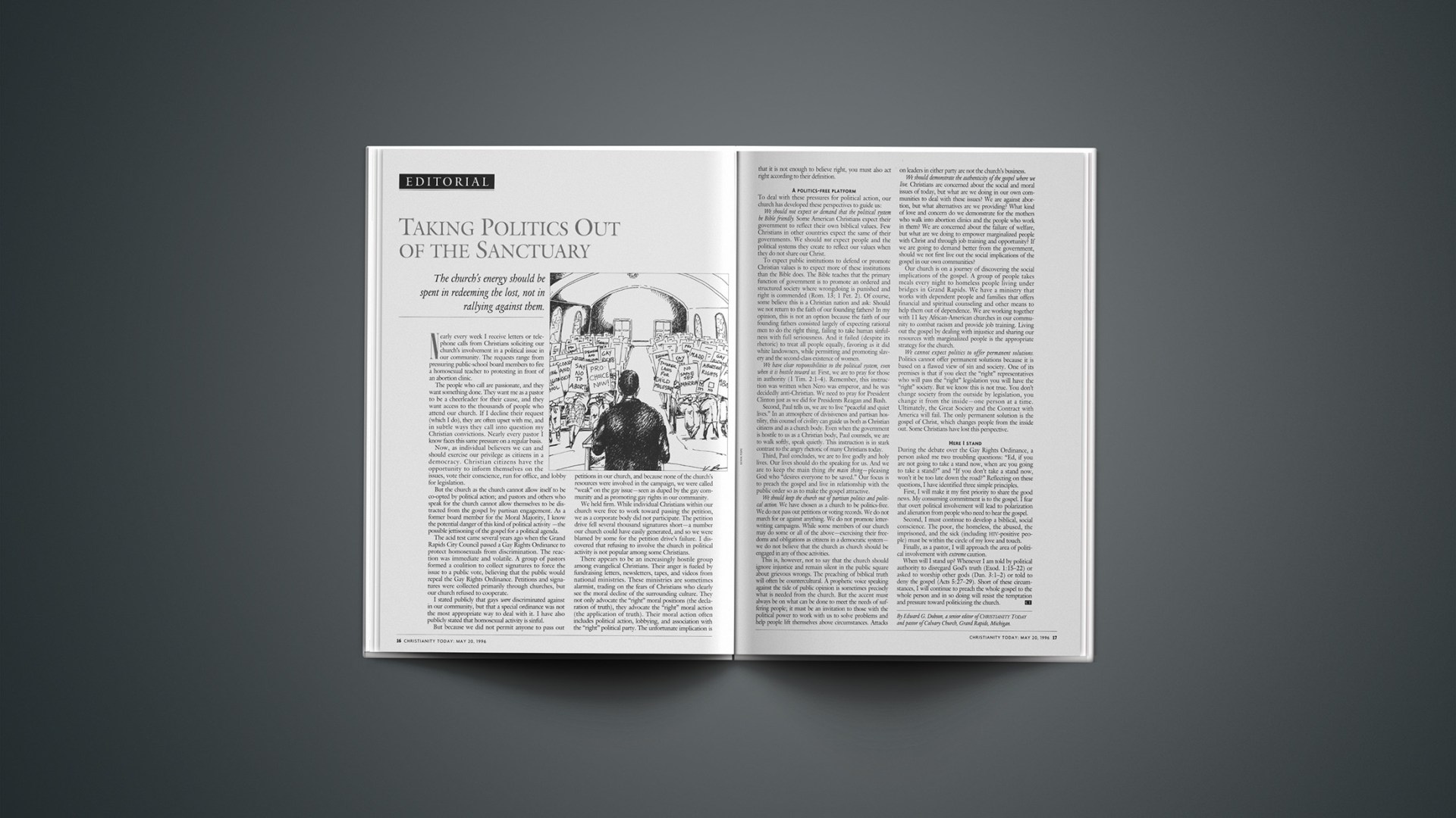 Nearly every week I receive letters or telephone calls from Christians soliciting our church’s involvement in a political issue in our community. The requests range from pressuring public-school board members to fire a homosexual teacher to protesting in front of an abortion clinic.