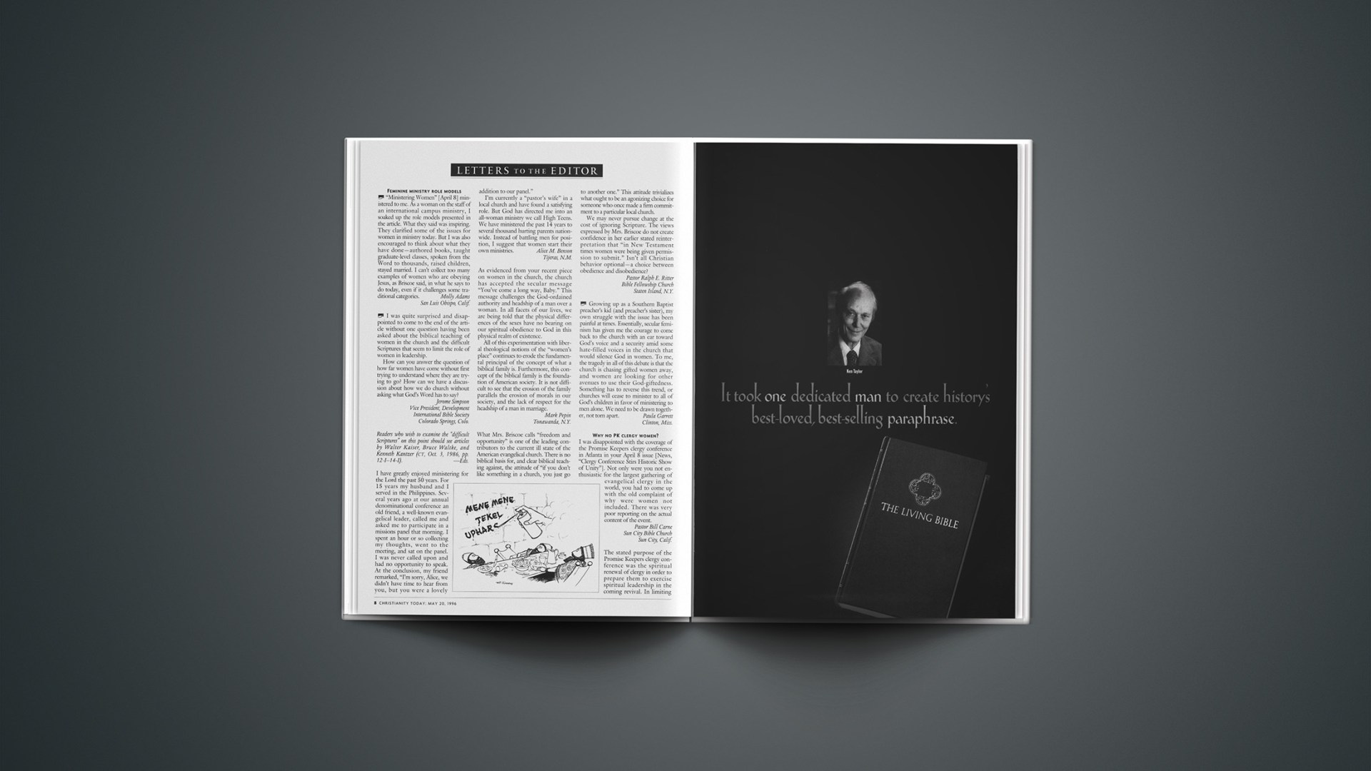 * “Ministering Women” [April 8] ministered to me. As a woman on the staff of an international campus ministry, I soaked up the role models presented in the article. What they said was inspiring. They clarified some of the issues for women in ministry today. But I was also encouraged to think about what they have done–authored books, taught graduate-level classes, spoken from the Word to thousands, raised children, stayed married. I can’t collect too many examples of women who are obeying Jesus, as Briscoe said, in what he says to do today, even if it challenges some traditional categories.