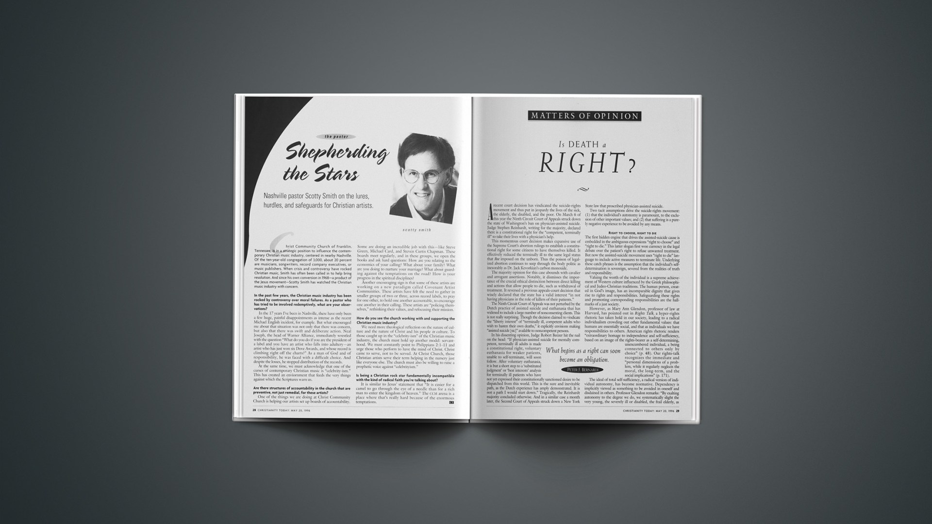 Christ Community Church of Franklin, Tennessee, is in a strategic position to influence the contemporary Christian music industry, centered in nearby Nashville. Of the ten-year-old congregation of 3,000, about 20 percent are musicians, songwriters, record company executives, or music publishers. When crisis and controversy have rocked Christian music, Smith has often been called in to help bring resolution. And since his own conversion in 1968–a product of the Jesus movement–Scotty Smith has watched the Christian music industry with concern.