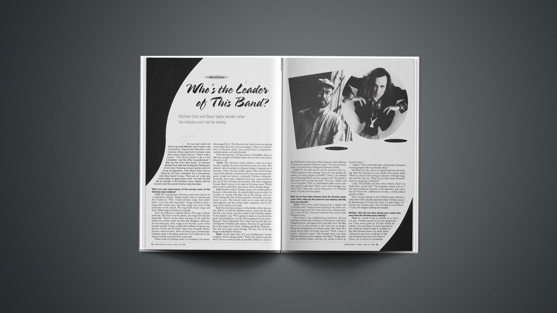 The two men could not look or be more different. Steve Taylor is the iconoclastic, long-haired, alternative rock musician whose repertoire includes tunes with curious names such as “I Want to Be a Clone,” “This Disco (Used to Be a Cute Cathedral),” and the often misunderstood “I Blew Up the Clinic Real Good.” In contrast, Michael Card, bald and anything but flamboyant, writes music featuring acoustic guitars and rich string arrangements, with album titles such as Known by the Scars, Scandalon, joy in the Journey, and Sleep Sound in Jesus. They are not a duo one would expect to agree about much. Yet each has felt like an outsider in the Christian music industry and has concerns over the course Christian music has taken.