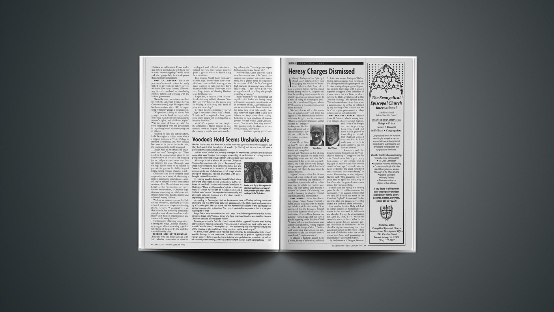 Although bishops of an Episcopal Church court indicated they were not judging the morality of homosexual behavior, their 7-to-1 decision to dismiss heresy charges against retired bishop Walter C. Righter will have far-reaching implications for the church’s position on homosexuality. In a May 15 ruling in Wilmington, Delaware, the court cleared Righter, who in 1990 ordained a professing homosexual to the diaconate.