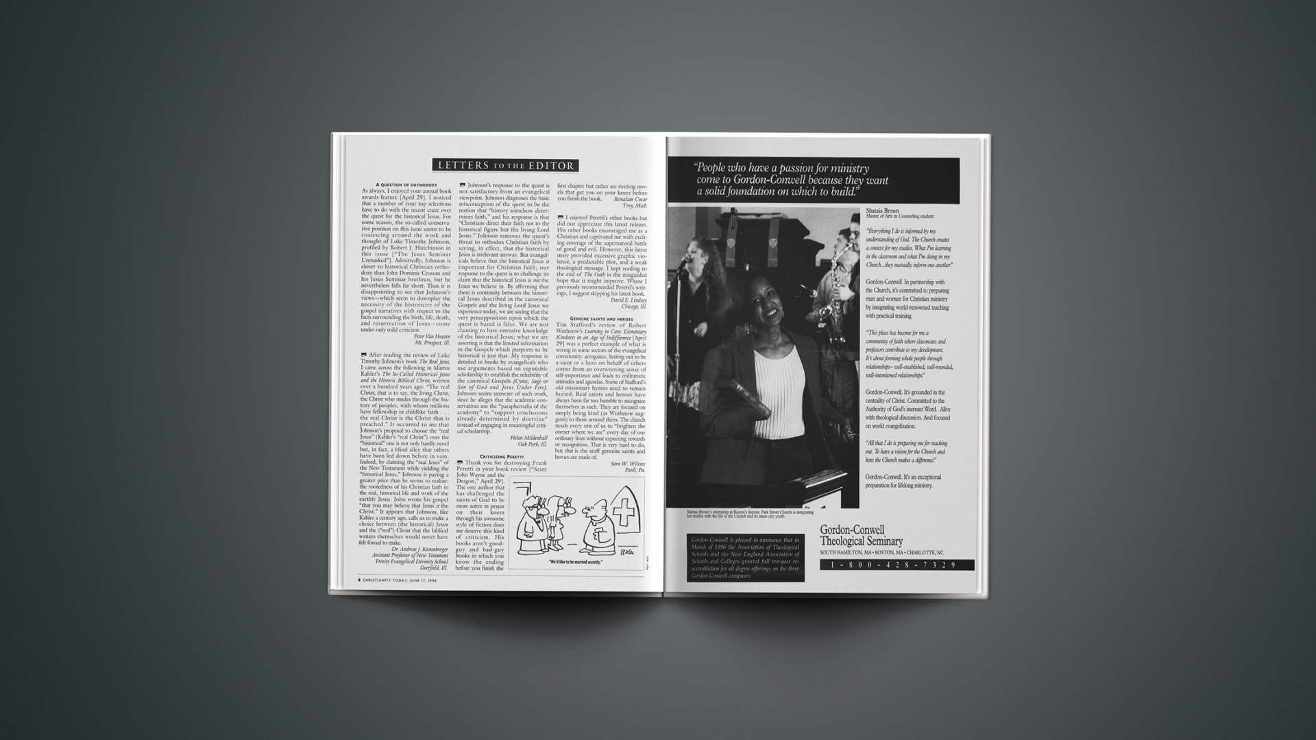 As always, I enjoyed your annual book awards feature [April 29]. I noticed that a number of your top selections have to do with the recent craze over the quest for the historical Jesus. For some reason, the so-called conservative position on this issue seems to be coalescing around the work and thought of Luke Timothy Johnson, profiled by Robert J. Hutchinson in this issue [“The Jesus Seminar Unmasked”]. Admittedly, Johnson is closer to historical Christian orthodoxy than John Dominic Crossan and his Jesus Seminar brethren, but he nevertheless falls far short. Thus it is disappointing to see that Johnson’s views–which seem to downplay the necessity of the historicity of the gospel narratives with respect to the facts surrounding the birth, life, death, and resurrection of Jesus–come under only mild criticism.