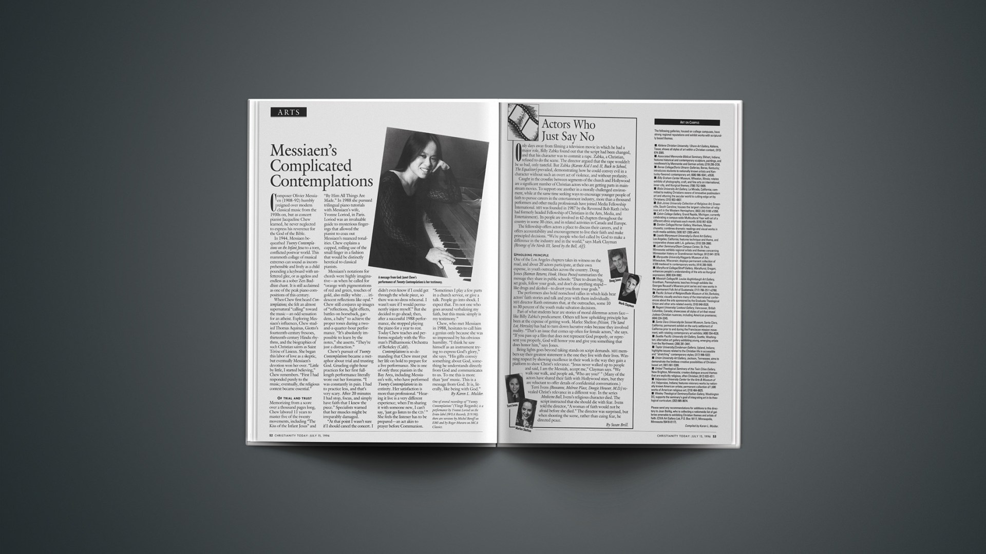 Contemplations is so demanding that Chew must put her life on hold to prepare for a live performance. She is one of only three pianists in the Bay Area, including Messiaen’s wife, who have performed Twenty Contemplations in its entirety. Her satisfaction is more than professional. “Hearing it live is a very different experience; when I’m sharing it with someone new, I can’t say, ‘just go listen to the CD.’ ” She feels the listener has to be prepared–an act akin to prayer before Communion. “Sometimes I play a few parts in a church service, or give a talk. People go into shock. I expect that. I’m not one who goes around verbalizing my faith, but this music simply is my testimony.”