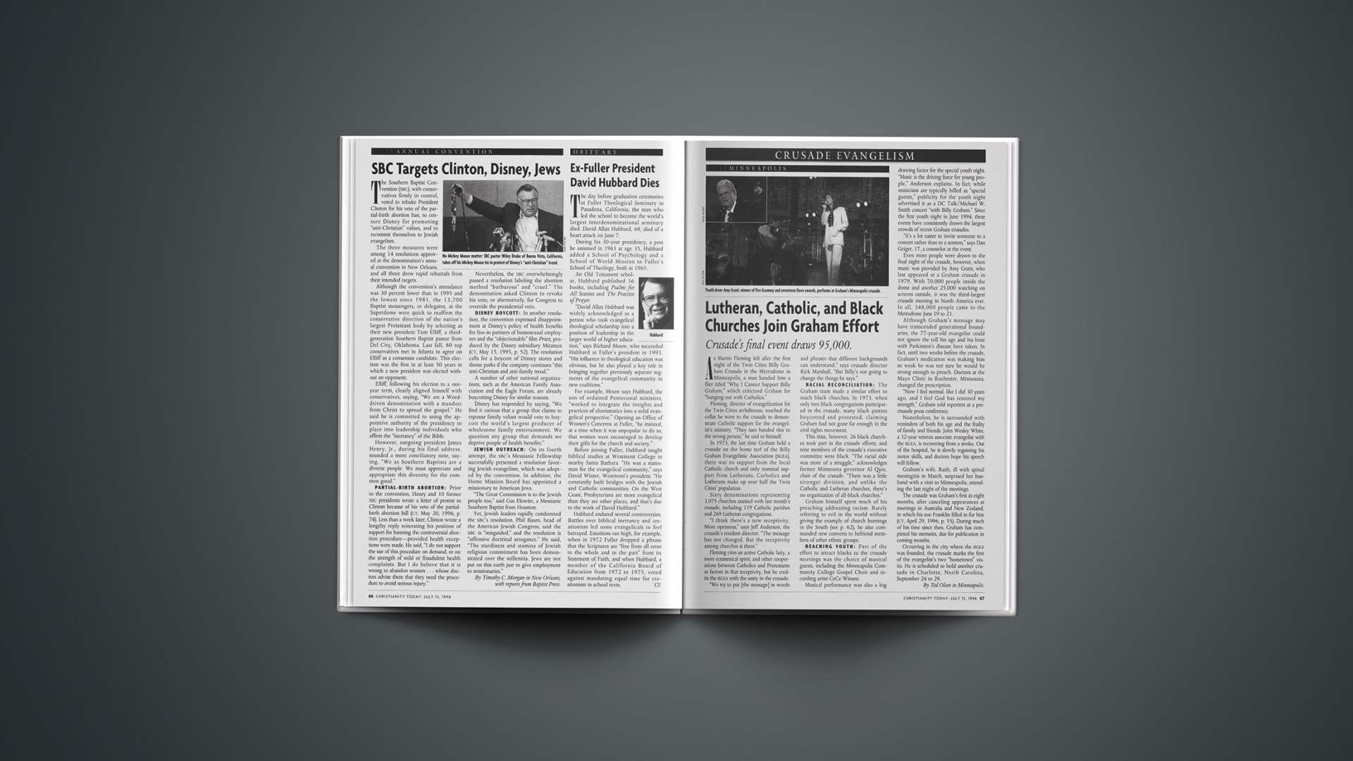 This time, however, 26 black churches took part in the crusade efforts, and nine members of the crusade’s executive committee were black. “The racial side was more of a struggle,” acknowledges former Minnesota governor Al Quie, chair of the crusade. “There was a little stronger division, and unlike the Catholic and Lutheran churches, there’s no organization of all-black churches.”