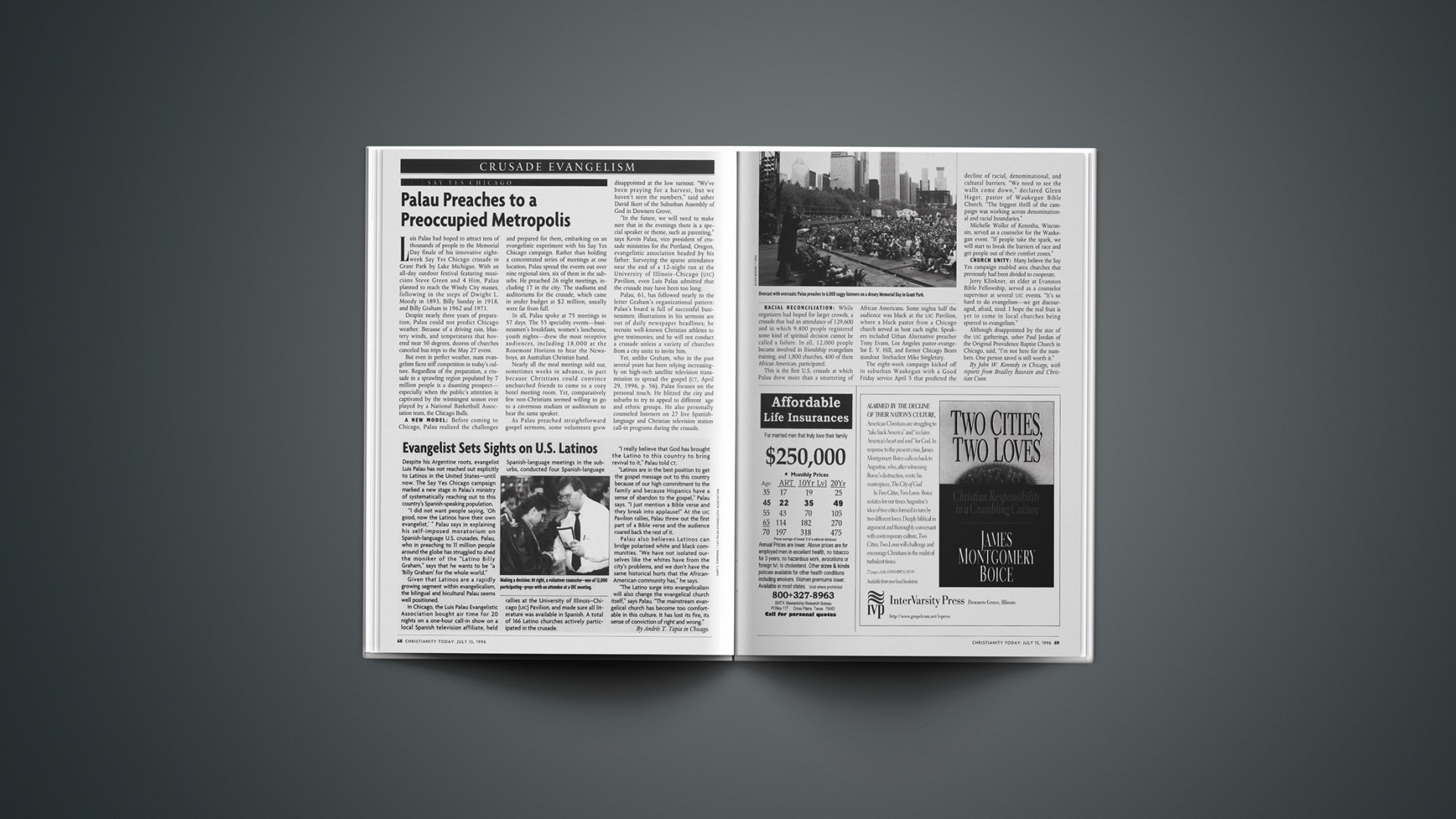 “In the future, we will need to make sure that in the evenings there is a special speaker or theme, such as parenting,” says Kevin Palau, vice president of crusade ministries for the Portland, Oregon, evangelistic association headed by his father. Surveying the sparse attendance near the end of a 12-night run at the University of Illinois-Chicago (UIC) Pavilion, even Luis Palau admitted that the crusade may have been too long.