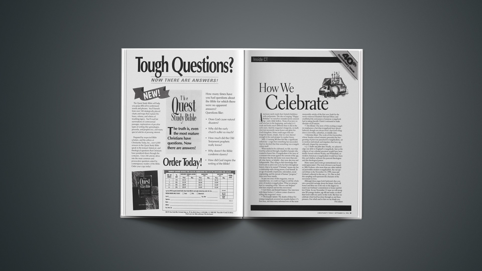 Americans rarely mark their fortieth birthdays with enthusiasm. The idea of singing “Happy Birthday” to ourselves sounded pretty unexciting-and a little hollow. None of us now on staff was here in the beginning, and today’s CT reads and looks much different than it did in the early years. And the magazine’s longevity, in itself, does not necessarily mean honor and glory for God’s kingdom. Some could argue that our longevity means, simply, that we were shrewd enough to live and prosper by market forces.