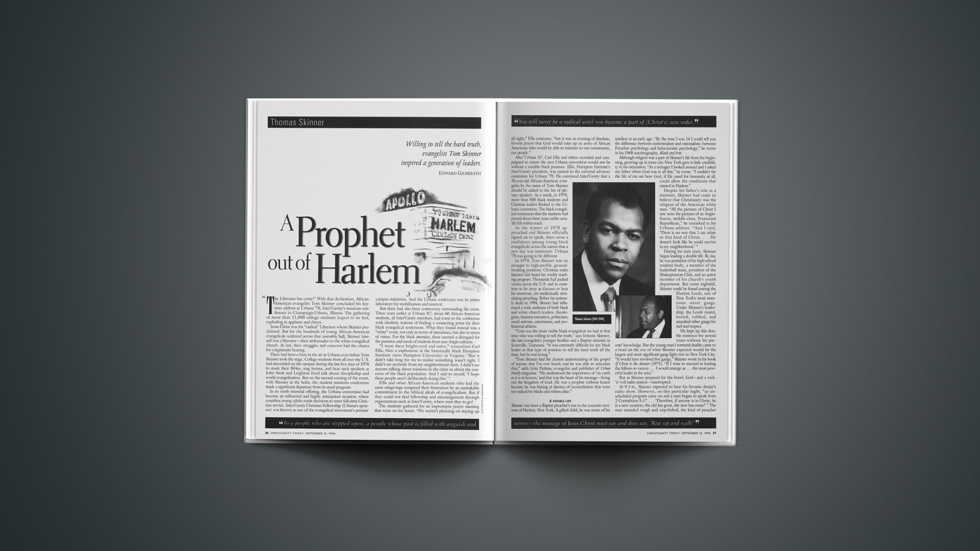 In 1970, Tom Skinner was no stranger to high-profile, ground-breaking positions. Christian radio listeners had heard his weekly teaching program. Thousands had packed venues across the U.S. and in countries as far away as Guyana to hear his streetwise, yet intellectually stimulating preaching. Before his untimely death in 1994, Skinner had influenced a wide audience of both black and white church leaders, theologians, business executives, politicians, social activists, entertainers, and professional athletes.