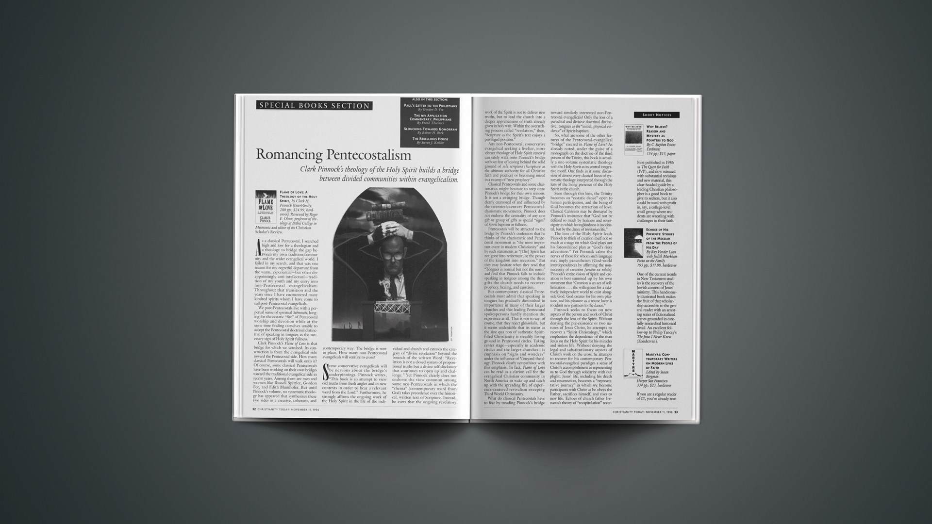 Clark Pinnock’s Flame of Love is that bridge for which we searched. Its construction is from the evangelical side toward the Pentecostal side. How many classical Pentecostals will walk onto it? Of course, some classical Pentecostals have been working on their own bridges toward the traditional evangelical side in recent years. Among them are men and women like Russell Spittler, Gordon Fee, and Edith Blumhofer. But until Pinnock’s volume, no systematic theology has appeared that synthesizes these two sides in a creative, coherent, and contemporary way. The bridge is now in place. How many non-Pentecostal evangelicals will venture to cross?