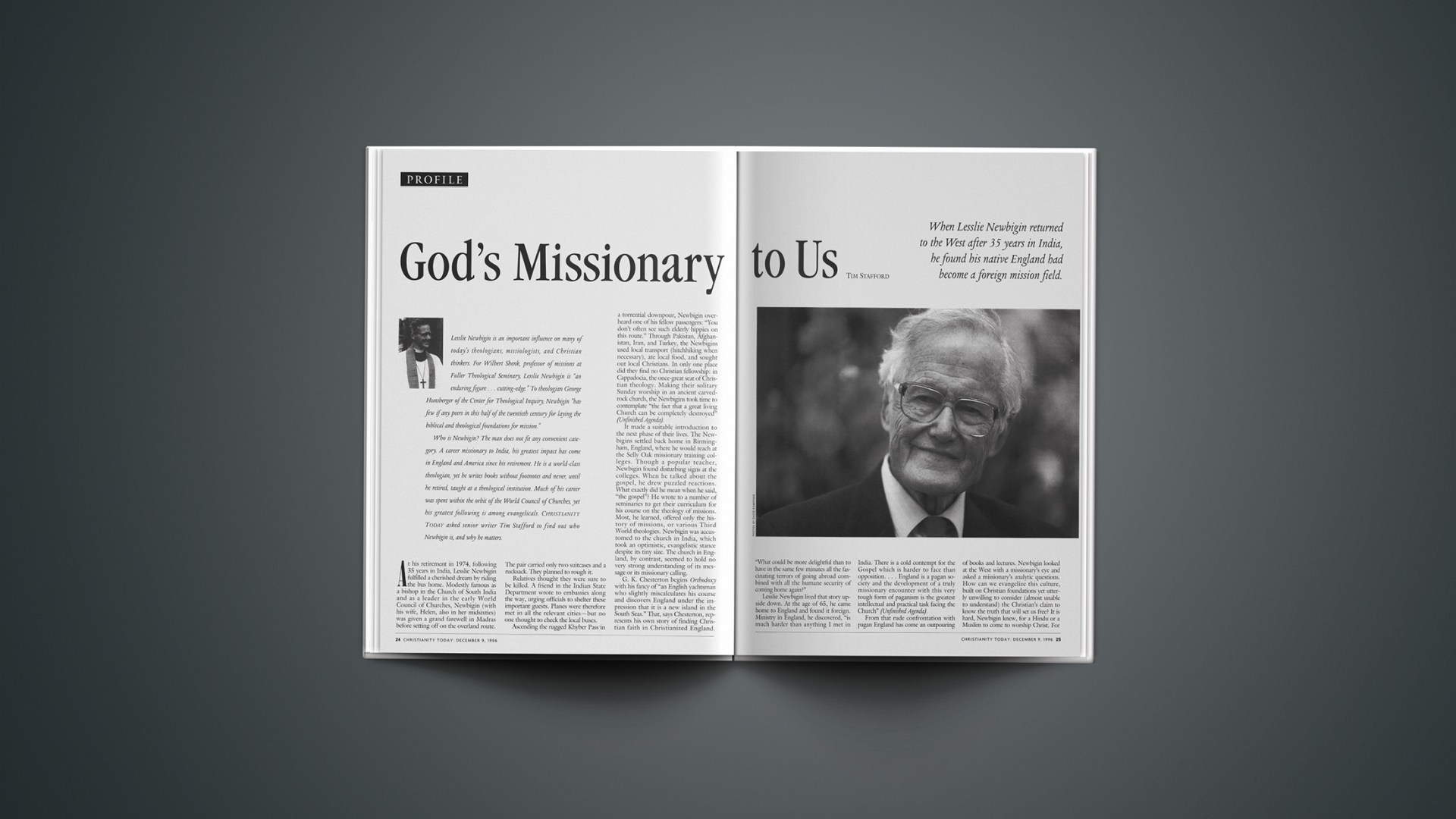 Who is Newbigin? The man does not fit any convenient category. A career missionary to India, his greatest impact has come in England and America since his retirement. He is a world-class theologian, yet he writes books without footnotes and never, until he retired, taught at a theological institution. Much of his career was spent within the orbit of the World Council of Churches, yet his greatest following is among evangelicals. CHRISTIANITY TODAY asked senior writer Tim Stafford to find out who Newbigin is, and why he matters.