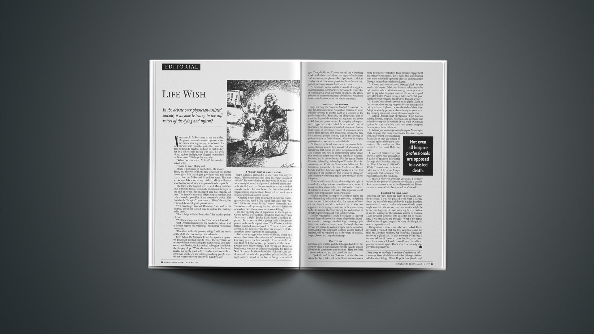 Even before the Supreme Court has spoken its piece on physician-assisted suicide (PAS), the merchants of managed death are recasting the name hospice into their own cost-effective, choice-limited toboggan ride down the slippery slope. While the country’s focus has been riveted on highly vocal sufferers who want to cut their own lives short, few are listening to dying people who do not want to shorten their lives, even by a day.