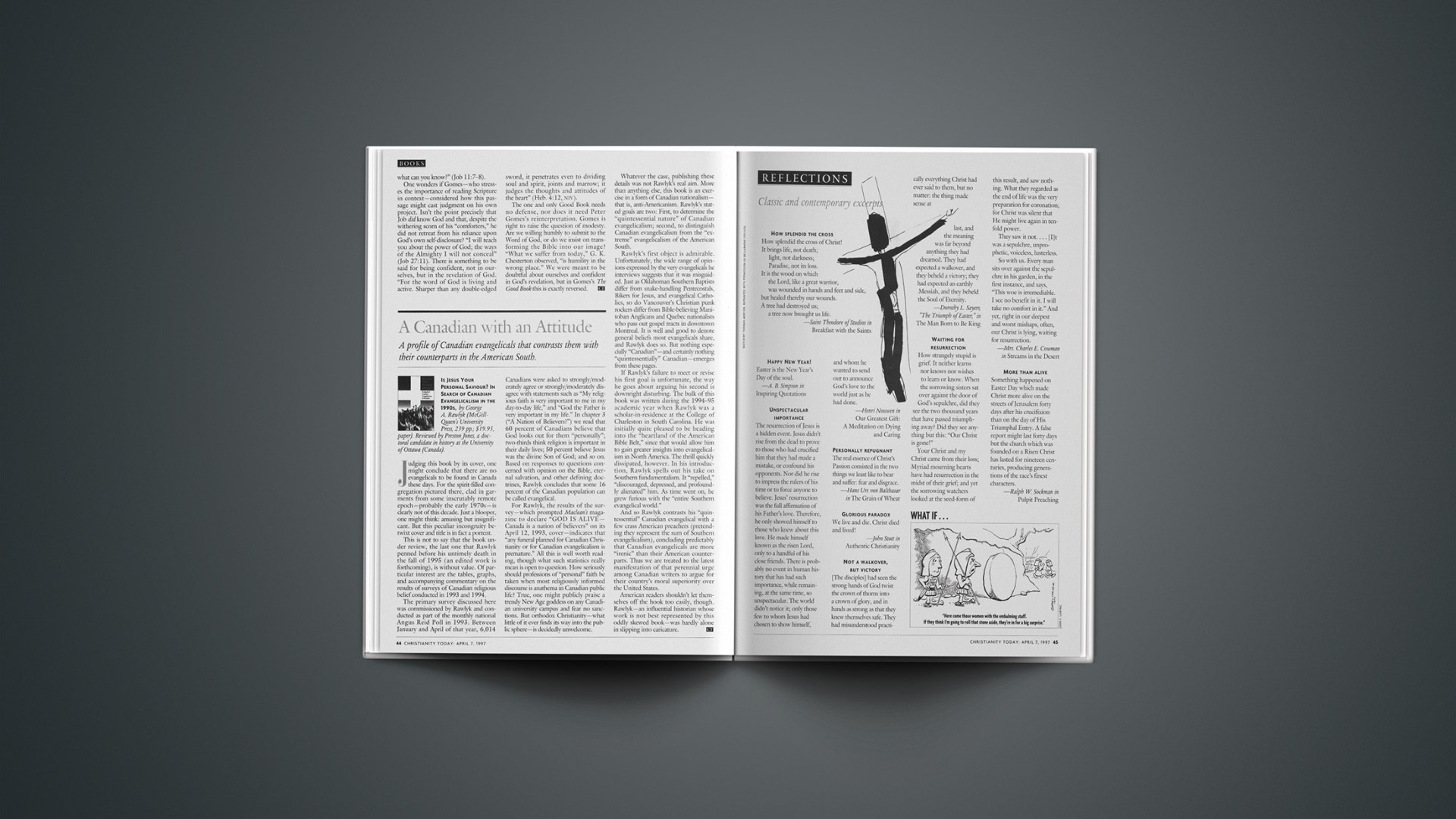 For Rawlyk, the results of the survey—which prompted Maclean’s magazine to declare “GOD IS ALIVE—Canada is a nation of believers” on its April 12, 1993, cover—indicates that “any funeral planned for Canadian Christianity or for Canadian evangelicalism is premature.” All this is well worth reading, though what such statistics really mean is open to question. How seriously should professions of “personal” faith be taken when most religiously informed discourse is anathema in Canadian public life? True, one might publicly praise a trendy New Age goddess on any Canadian university campus and fear no sanctions. But orthodox Christianity—what little of it ever finds its way into the public sphere—is decidedly unwelcome.