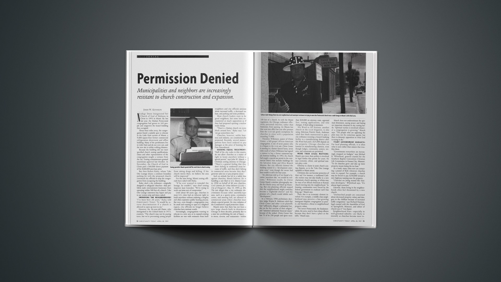 SEEKING EQUAL TREATMENT: “Half of the city codes in this country do not allow churches as a matter of right to locate anywhere without a special permit,” says John W. Mauck, a Christian zoning attorney in Chicago. “There’s a general feeling that they don’t belong in residential areas because of traffic, and they don’t belong in commercial areas because they don’t generate sales tax or pay property taxes.”