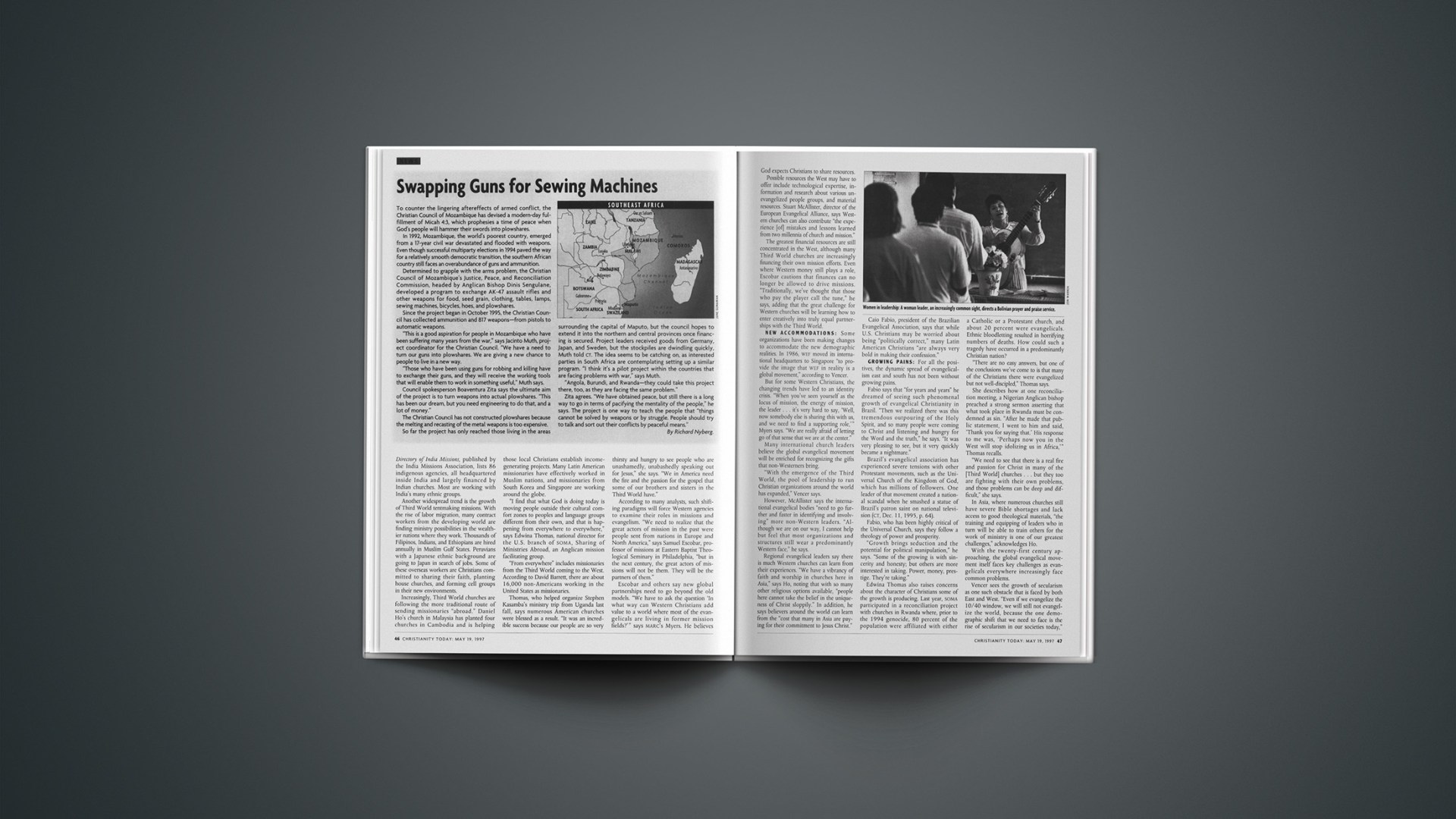 Determined to grapple with the arms problem, the Christian Council of Mozambique’s Justice, Peace, and Reconciliation Commission, headed by Anglican Bishop Dinis Sengulane, developed a program to exchange AK-47 assault rifles and other weapons for food, seed grain, clothing, tables, lamps, sewing machines, bicycles, hoes, and plowshares.