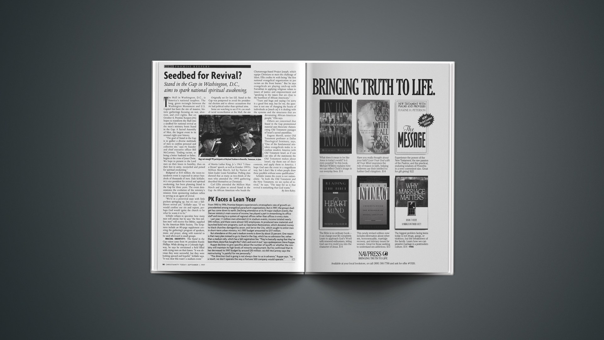 The Mall in Washington, D.C., is America’s national soapbox. The long, green rectangle between the Washington Monument and U.S. Capitol has been the site of massive, historic gatherings focusing on war, abortion, and civil rights. But on October 4, Promise Keepers (PK) hopes to transform the Mall into a seedbed for national revival as the men’s ministry hosts Stand in the Gap: A Sacred Assembly of Men, the largest event in its unusual eight-year history.