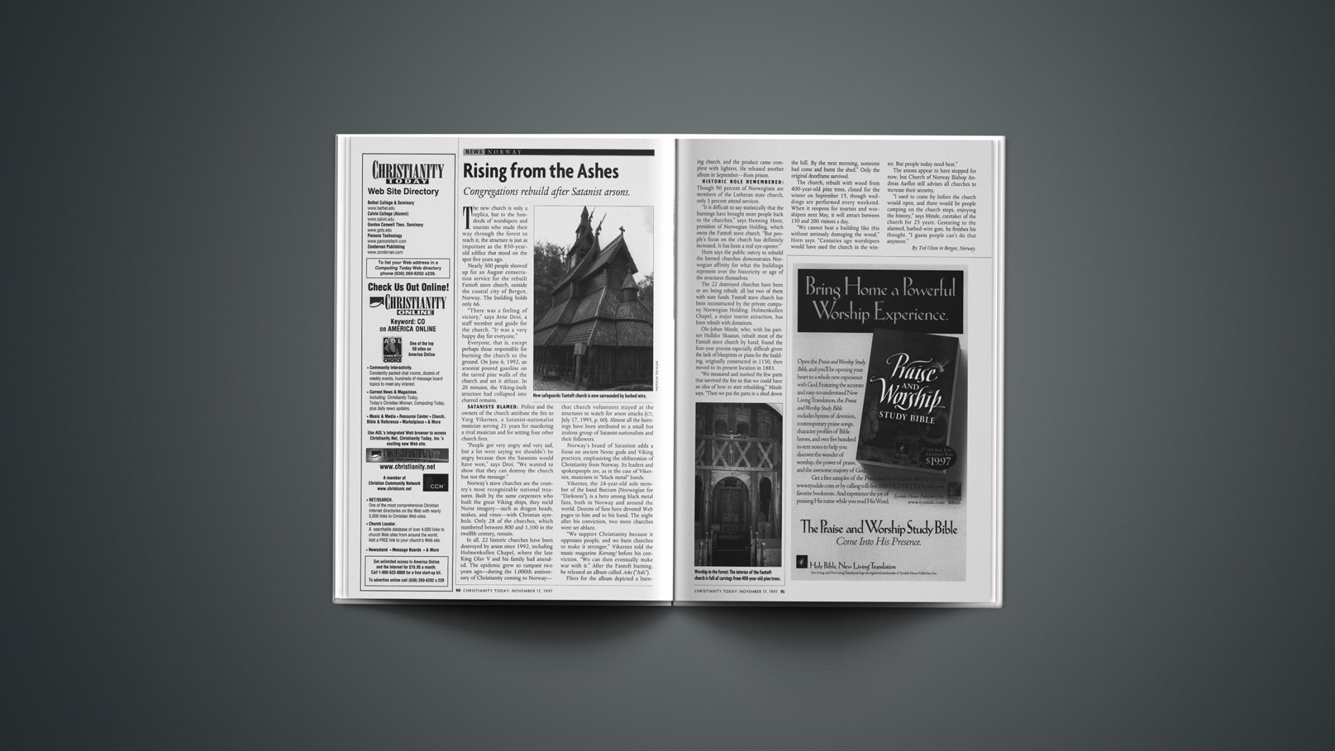 In all, 22 historic churches have been destroyed by arson since 1992, including Holmenkollen Chapel, where the late King Olav V and his family had attended. The epidemic grew so rampant two years ago—during the 1,000th anniversary of Christianity coming to Norway—that church volunteers stayed at the structures to watch for arson attacks (CT, July 17, 1995, p. 60). Almost all the burnings have been attributed to a small but zealous group of Satanist-nationalists and their followers.