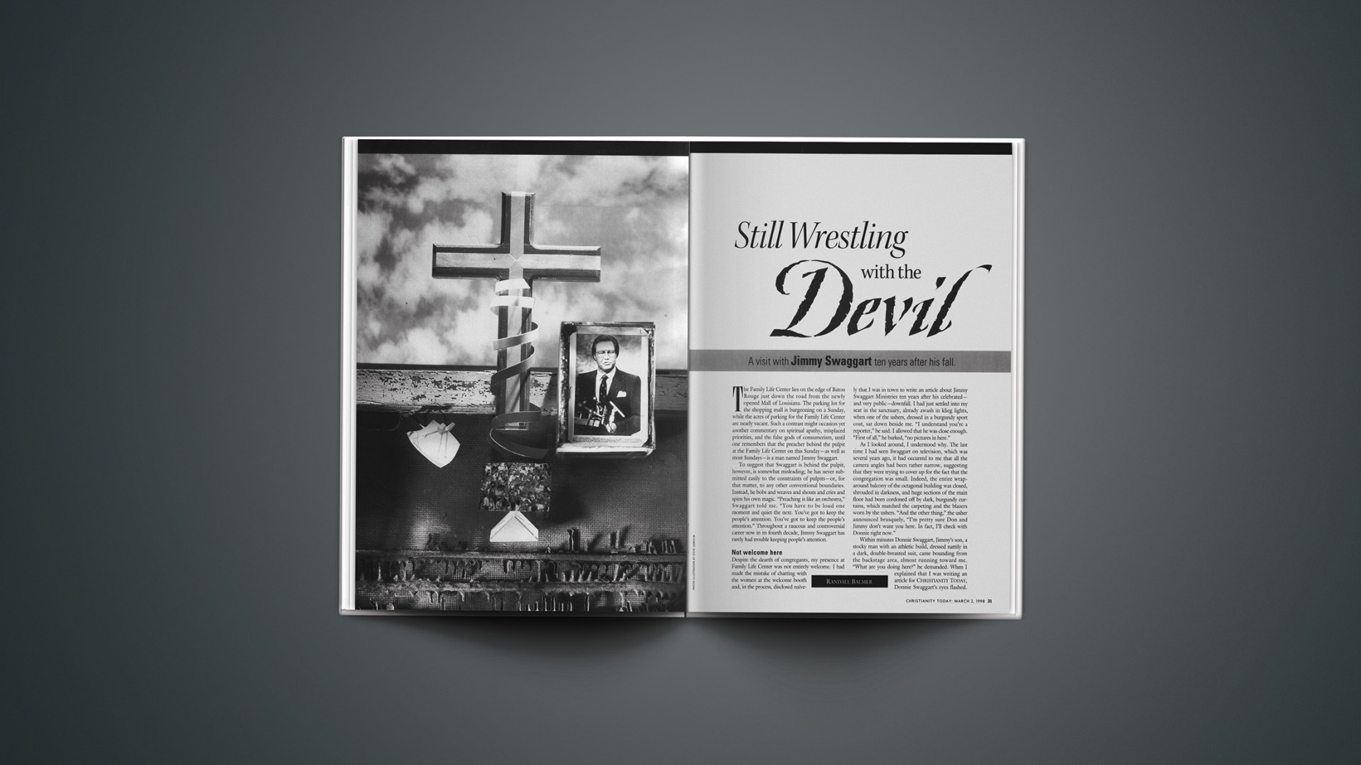Swaggart himself couldn’t have been more gracious. He is a kind man who, unlike some other “televangelists,” is not afraid to meet your eyes. Lest there be any confusion or false pretenses, I informed him immediately of my purpose for visiting Baton Rouge and told him of my admiration for his preaching abilities. The mention of CHRISTIANITY TODAY, however, brought a change in his countenance, not so much anger or defiance, as it had with Donnie, but sadness. “I’m afraid I won’t be able to help you,” he said, shaking his head. “That magazine has said some pretty hurtful things about me.” He shifted his eyes briefly toward the middle distance, then back at me. From the corner of my eye I could see my tail, Bill Wilson, shuffling nervously.