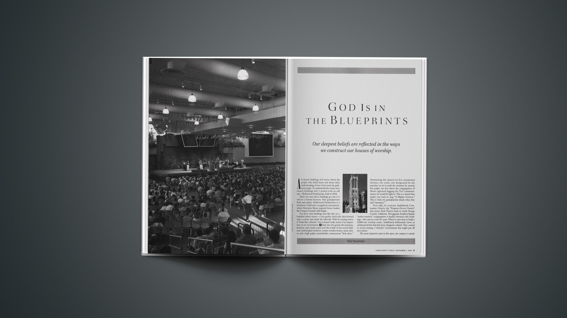 Nobody keeps statistics on church buildings in America, so that, for example, no one can say with any accuracy how many display a cross as a central focus of worship, or how many use pews as opposed to individual seating. I visited new churches in the Los Angeles area because there are lots of new churches to see and because California continues to influence the nation. In particular, Southern California is a leader in producing what usc’s Donald Miller calls the “new paradigm churches”—those like Calvary Chapel or the Vineyard, which have taken a decidedly untraditional path. I did not only visit “seeker sensitive” or “new paradigm” churches, however. I saw a wide spectrum—Presbyterian and Episcopal, Baptist and Christian and Missionary Alliance. I also talked to pastors, architects, and church administrators in other parts of the country, so I have some sense that what I describe is not unique to L.A.
