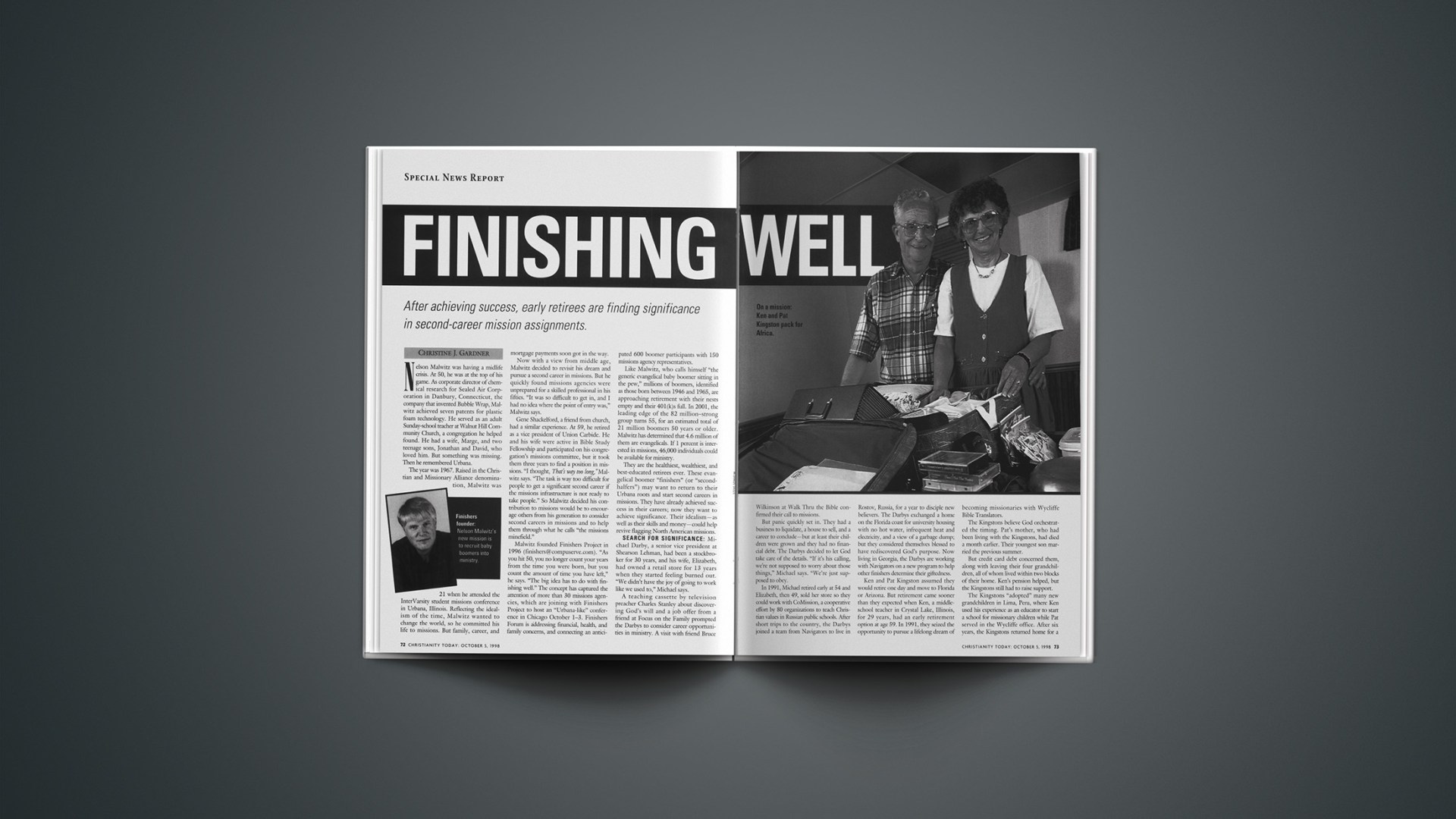 Malwitz founded Finishers Project in 1996 (finishers@compuserve.com). “As you hit 50, you no longer count your years from the time you were born, but you count the amount of time you have left,” he says. “The big idea has to do with finishing well.” The concept has captured the attention of more than 30 missions agencies, which are joining with Finishers Project to host an “Urbana-like” conference in Chicago October 1-3. Finishers Forum is addressing financial, health, and family concerns, and connecting an anticipated 600 boomer participants with 150 missions agency representatives.