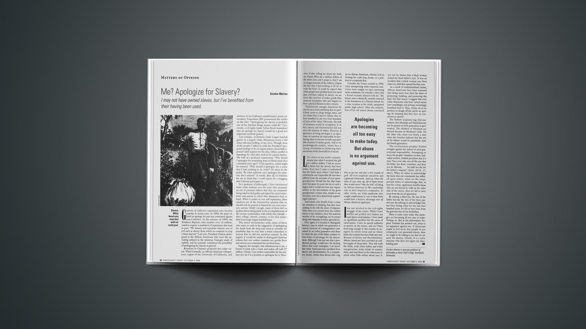 Last summer, in between Little League baseball games in a largely white Minnesota town, I did some informal polling of my own. Though none of the people I talked to took the President’s proposed apology to be an urgent matter, about half expressed mild support for the idea. Others scoffed at repenting for what they took to be ancient history. The wife of a professor commented, “Why should I apologize for something done to blacks more than a hundred years ago?” A fair question, which might be restated: “Why should I apologize for a crime that I had nothing to do with?” Or more to the point, “By what authority can I apologize for someone else’s actions?” It would, after all, be hubristic for me to think that I could repent for a mugging that I did not participate in.