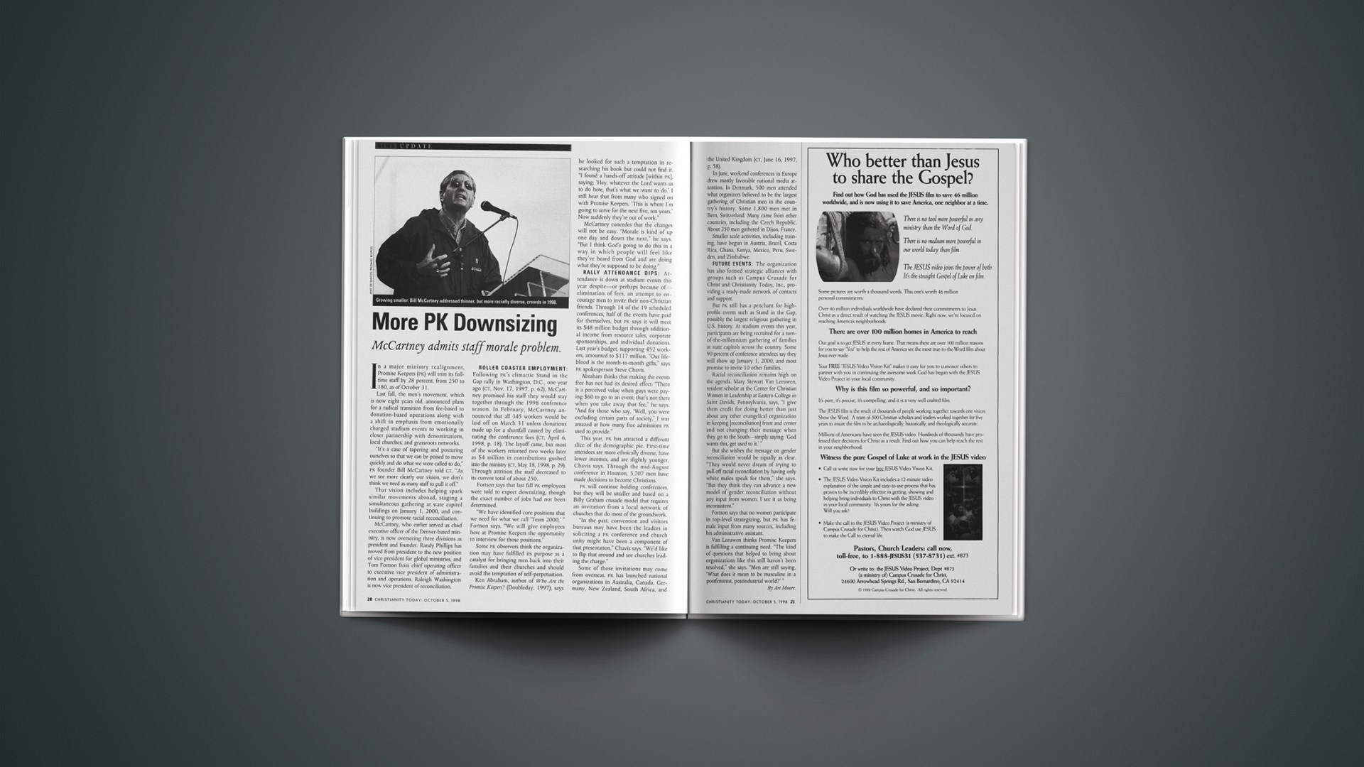ROLLER COASTER EMPLOYMENT: Following PK’s climactic Stand in the Gap rally in Washington, D.C., one year ago (CT, Nov. 17, 1997, p. 62), McCartney promised his staff they would stay together through the 1998 conference season. In February, McCartney announced that all 345 workers would be laid off on March 31 unless donations made up for a shortfall caused by eliminating the conference fees (CT, April 6, 1998, p. 18). The layoff came, but most of the workers returned two weeks later as $4 million in contributions gushed into the ministry (CT, May 18, 1998, p. 29). Through attrition the staff decreased to its current total of about 250.