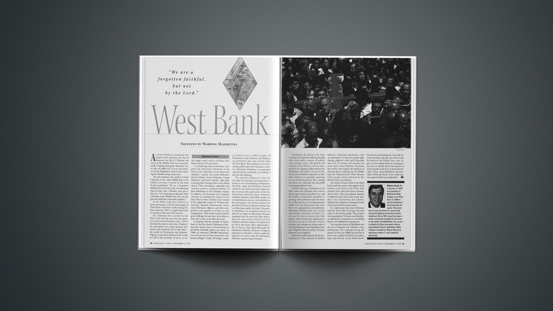 Bishara Awad, 59, is founder (in 1979) and president of Bethlehem Bible College in the West Bank. In 1948 he and his Palestinian family became refugees. That same year he lost his father to a stray bullet during the fighting surrounding Israel’s statehood. Since 1972, Awad had been a leader among the evangelical churches in Jerusalem and Bethlehem. He currently attends the East Jerusalem International Baptist Church. Bethlehem Bible College is located on Hebron Road and welcomes visitors. E-mail: bethbc@planet.edu