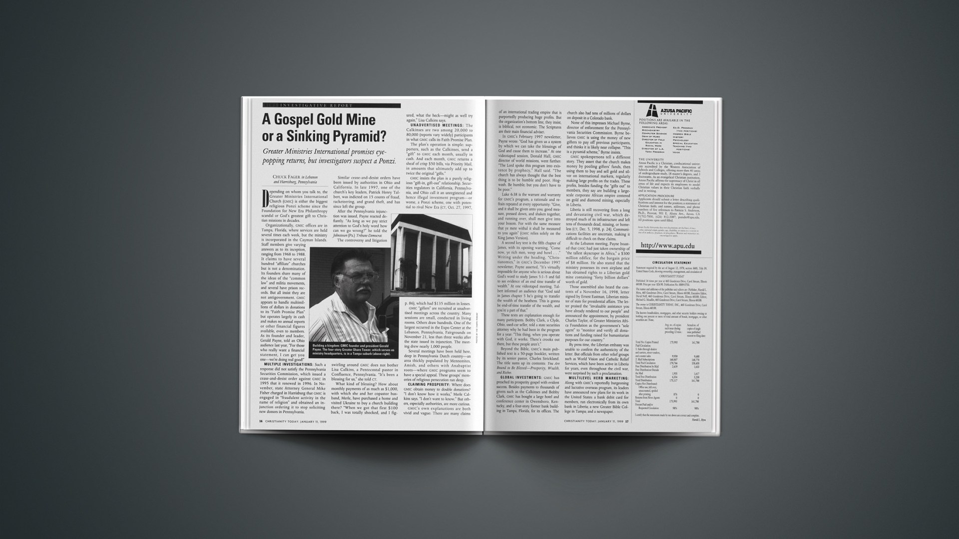 Organizationally, GMIC offices are in Tampa, Florida, where services are held several times each week, but the ministry is incorporated in the Cayman Islands. Staff members give varying answers as to its inception, ranging from 1968 to 1988. It claims to have several hundred “affiliate” churches but is not a denomination. Its founders share many of the ideas of the “common law” and militia movements, and several have prison records. But all insist they are not antigovernment. GMIC appears to handle multimillions of dollars in donations to its “Faith Promise Plan” but operates largely in cash and makes no annual reports or other financial figures available, even to members. As its founder and leader, Gerald Payne, told an Ohio audience last year, “For those who really want a financial statement, I can get you one—we’re doing real good!”