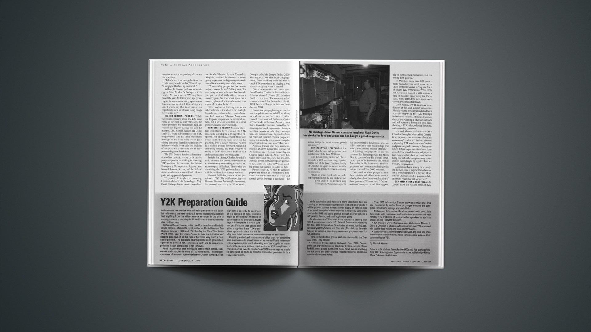Between those extremes is the need for churches and individuals to prepare. Michael S. Hyatt, author of The Millennium Bug (Regnery Gateway, 1998) and Y2K: The Day the World Shut Down (Word, 1998), says Christians “need to take the initiative and become proactive. If all this fails, it becomes very much a consumer problem.” He suggests lobbying utilities and government agencies to demand Y2K compliance early and to prepare for problems if such compliance is not achieved.