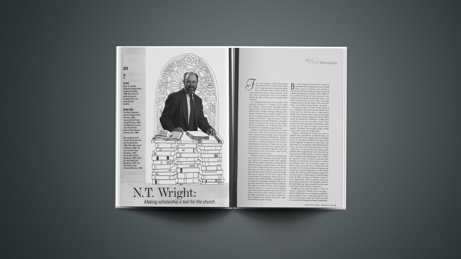 Wright is a big-hearted, friendly bear of a man, who loves to talk, loves to debate on television, loves to preach, and thoroughly enjoys being dean of Lichfield Cathedral near Birmingham, England. (The dean of a cathedral more or less runs the place, and serves as an official Somebody in the district.) By personality and position, Wright does not seem to be a scholar at all. Indeed, the ongoing battle of his life seems to be putting enough days aside to sit at his desk and write the massive tomes he has already plotted out in his mind.