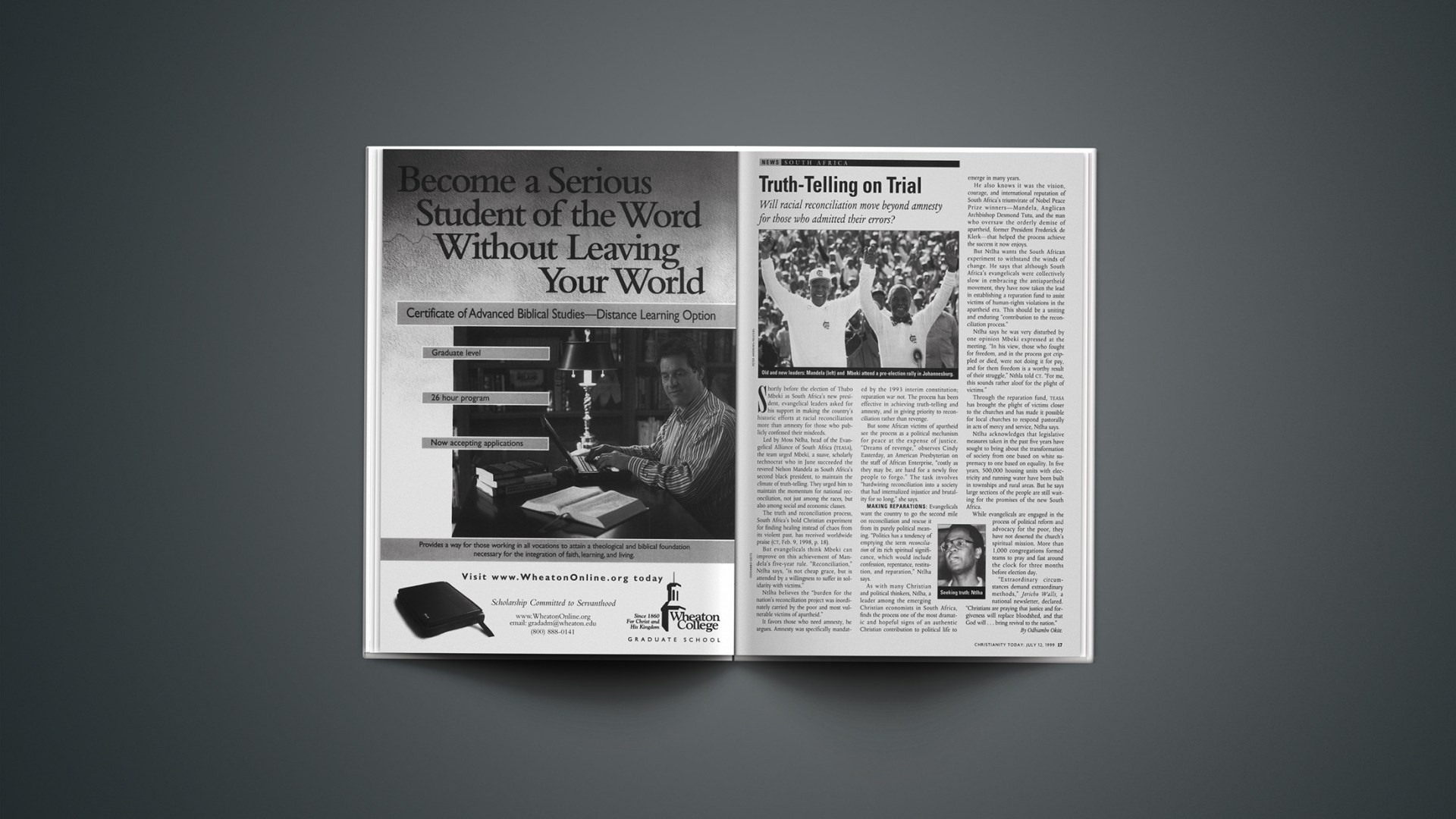 The truth and reconciliation process, South Africa’s bold Christian experiment for finding healing instead of chaos from its violent past, has received worldwide praise (CT, Feb. 9, 1998, p. 18).