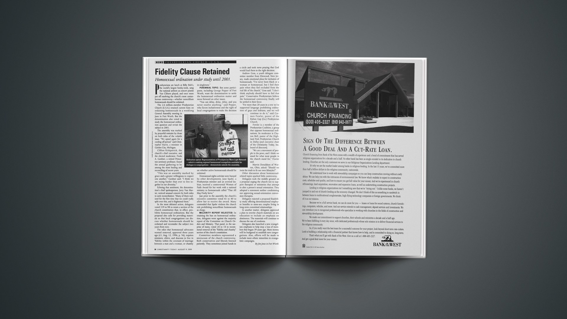 The 2.6 millionmember Presbyterian Church (U.S.A.) retained current bans on ordaining homosexuals in a weeklong General Assembly meeting in June in Fort Worth. But the denomination also voted to study the homosexual ordination question and revisit the subject in 2001.
