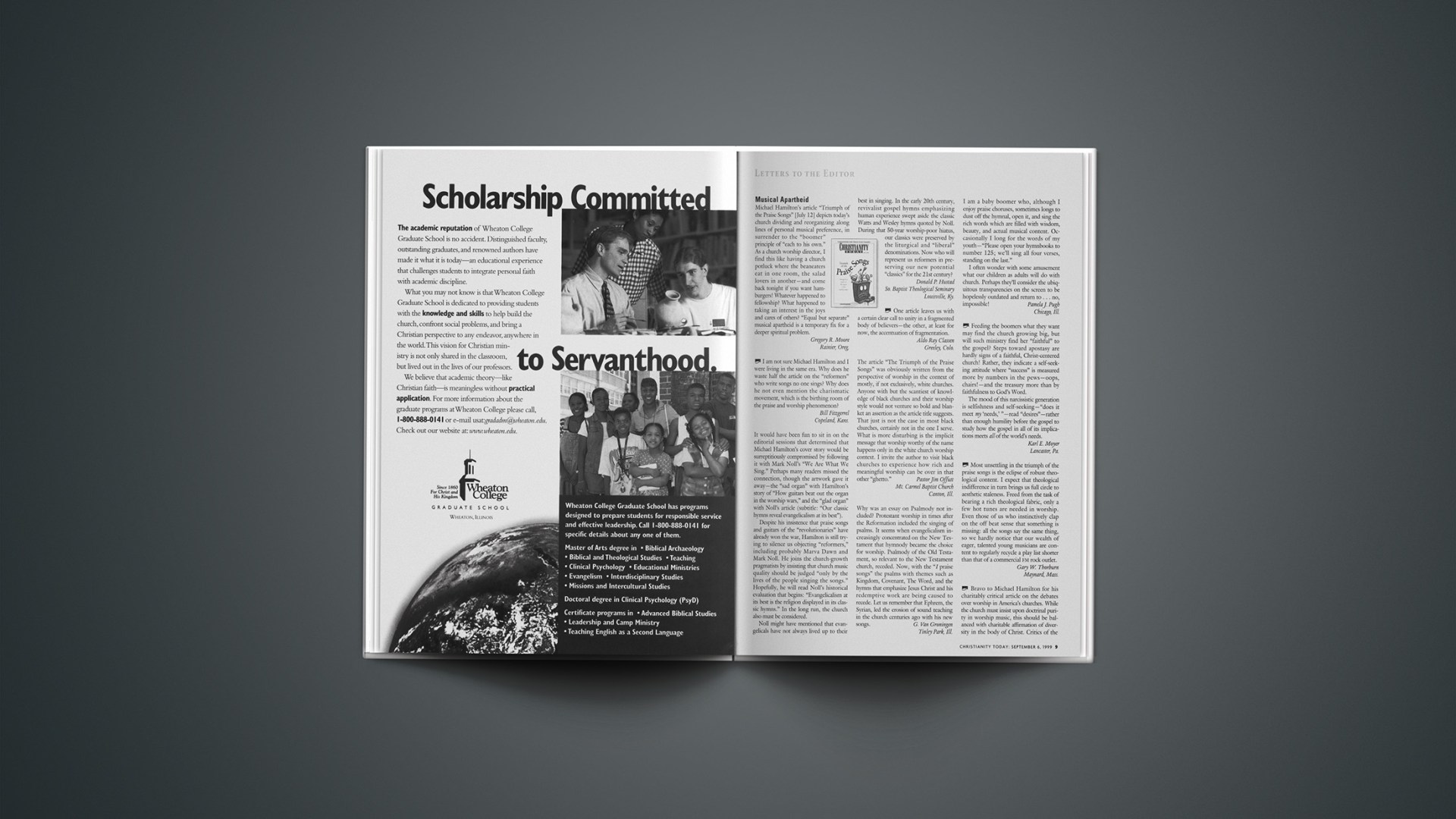It would have been fun to sit in on the editorial sessions that determined that Michael Hamilton’s cover story would be surreptitiously compromised by following it with Mark Noll’s “We Are What We Sing.” Perhaps many readers missed the connection, though the artwork gave it away—the “sad organ” with Hamilton’s story of “How guitars beat out the organ in the worship wars,” and the “glad organ” with Noll’s article (subtitle: “Our classic hymns reveal evangelicalism at its best”).