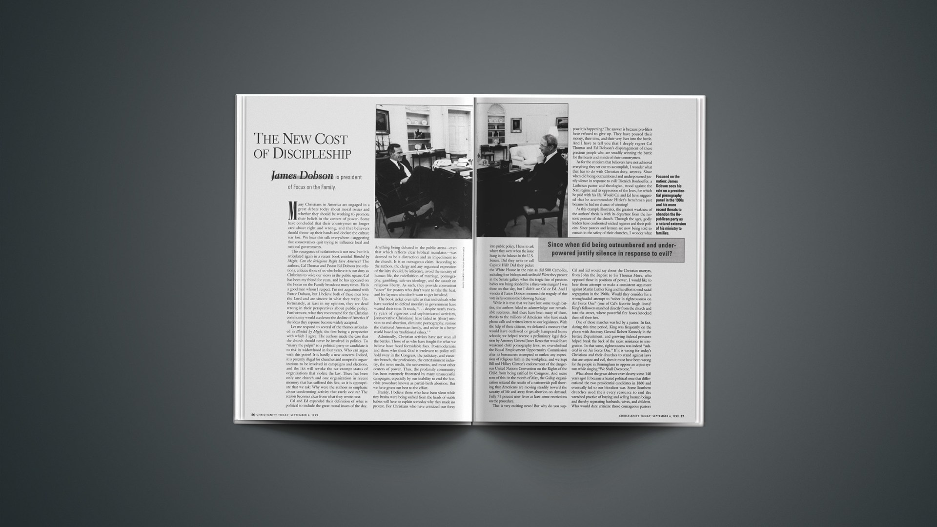What about the great debate over slavery some 140 years ago? It became a heated political issue that differentiated the two presidential candidates in 1860 and eventually led to our bloodiest war. Some Southern churches used their every resource to end the wretched practice of buying and selling human beings and thereby separating husbands, wives, and children. Who would dare criticize those courageous pastors today, who were undoubtedly maligned at the time, for speaking out against the Confederacy? No one; and yet Cal and Ed now offer this ill-considered advice to today’s churches, urging them to ignore the current moral crisis in government and society.