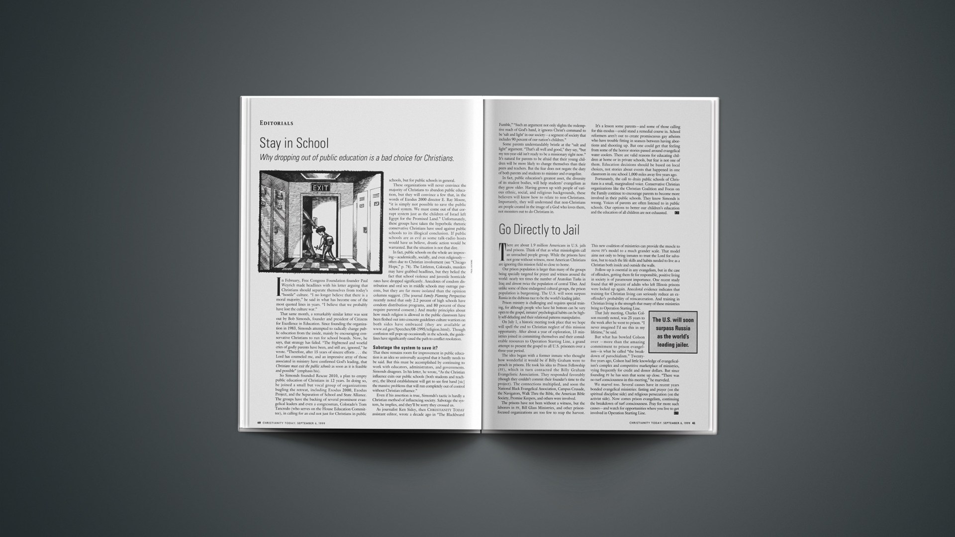 As journalist Ken Sidey, then Christianity Today assistant editor, wrote a decade ago in “The Blackboard Fumble,” “Such an argument not only slights the redemptive reach of God’s hand, it ignores Christ’s command to be ‘salt and light’ in our society—a segment of society that includes 90 percent of our nation’s children.”