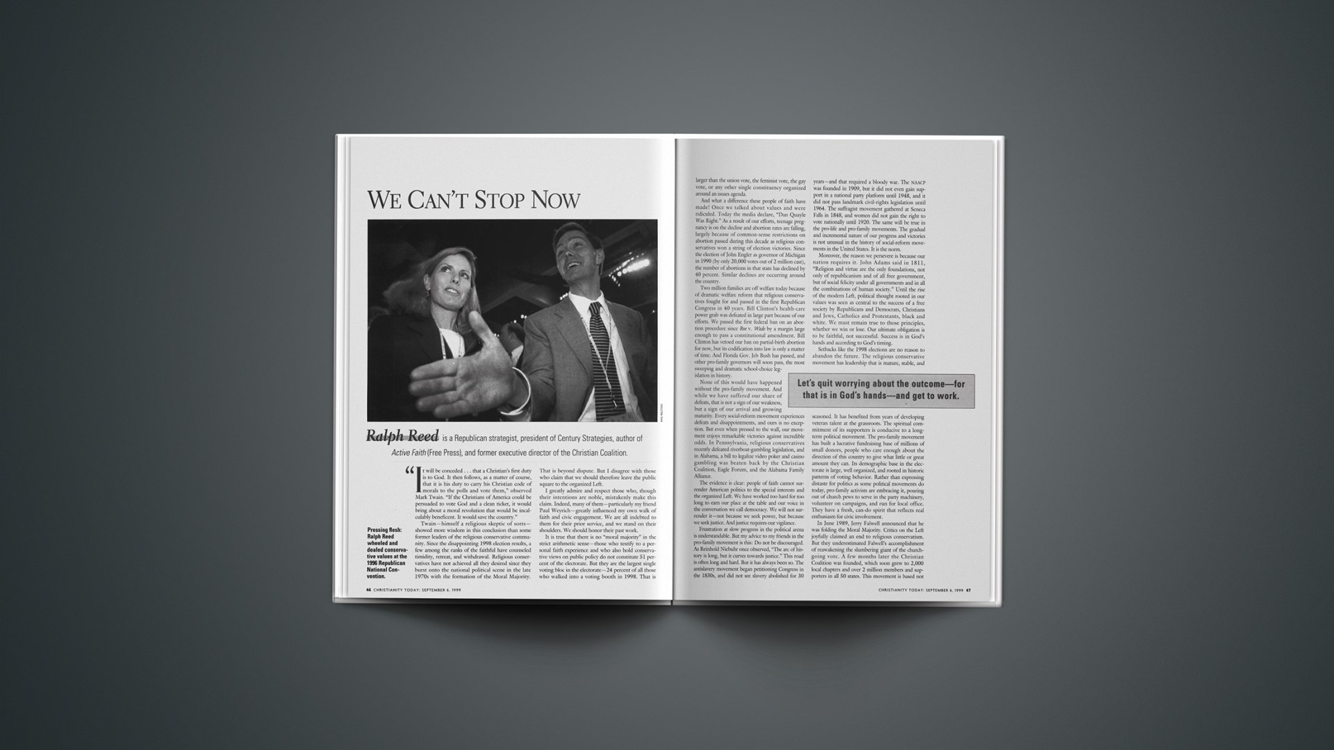 Twain—himself a religious skeptic of sorts—showed more wisdom in this conclusion than some former leaders of the religious conservative community. Since the disappointing 1998 election results, a few among the ranks of the faithful have counseled timidity, retreat, and withdrawal. Religious conservatives have not achieved all they desired since they burst onto the national political scene in the late 1970s with the formation of the Moral Majority. That is beyond dispute. But I disagree with those who claim that we should therefore leave the public square to the organized Left.