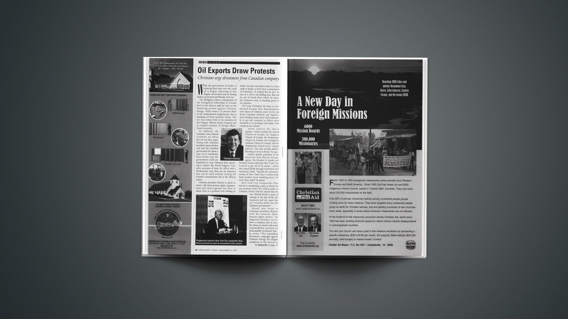 The Religious Liberty Commission of the Evangelical Fellowship of Canada (RLC) is the latest to add its voice to the mounting protest against Talisman Energy, which owns a 25 percent share of the multinational conglomerate that is pumping oil from southern Sudan. The RLC has written both to the president of the Calgary, Alberta-based company and to Canada’s minister of foreign affairs, Lloyd Axworthy.