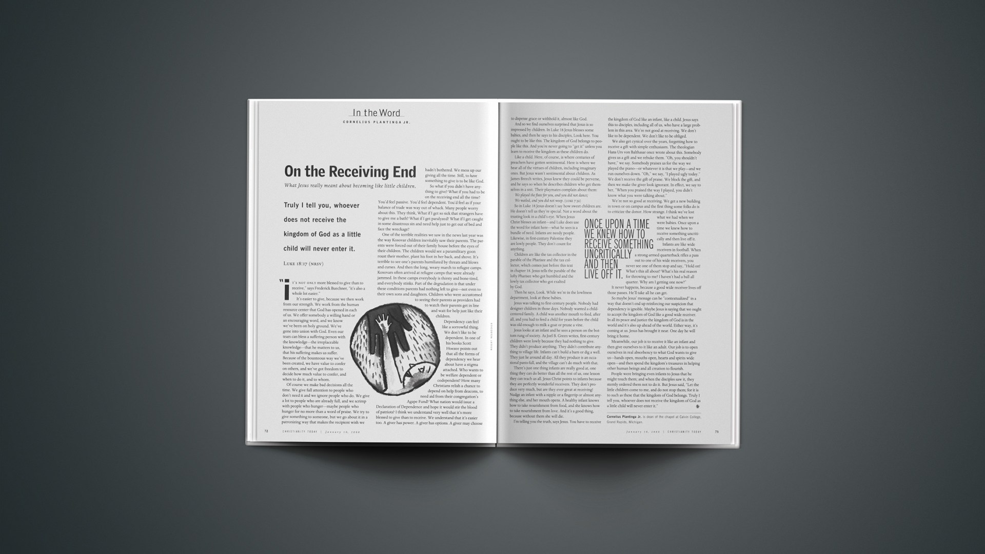We're not so good at receiving. We get a new building in town or on campus and the first thing some folks do is to criticize the donor. How strange. I think we've lost what we had when we were babies. Once upon a time we knew how to receive something uncritically and then live off it.Infants are like wide receivers in football. When a strong-armed quarterback rifles a pass out to one of his wide receivers, you never see one of them stop and say, "Hold on! What's this all about? What's his real reason for throwing to me? I haven't had a ball all quarter. Why am I getting one now?"It never happens, because a good wide receiver lives off those passes. He'll take all he can get.So maybe Jesus' message can be "contextualized" in a way that doesn't end up reinforcing our suspicion that dependency is ignoble. Maybe Jesus is saying that we ought to accept the kingdom of God like a good wide receiver. In all its peace and justice the kingdom of God is in the world and it's also up ahead of the world. Either way, it's coming at us. Jesus has brought it near. One day he will bring it home.Meanwhile, our job is to receive it like an infant and then give ourselves to it like an adult. Our job is to open ourselves in real absorbency to what God wants to give us—hands open, mouths open, hearts and spirits wide open—and then spend the kingdom's treasures in helping other human beings and all creation to flourish.People were bringing even infants to Jesus that he might touch them; and when the disciples saw it, they sternly ordered them not to do it. But Jesus said, "Let the little children come to me, and do not stop them; for it is to such as these that the kingdom of God belongs. Truly I tell you, whoever does not receive the kingdom of God as a little child will never enter it."Cornelius Plantinga Jr. is dean of the chapel at Calvin College, Grand Rapids, Michigan.Illustration by Robert Neubecker.