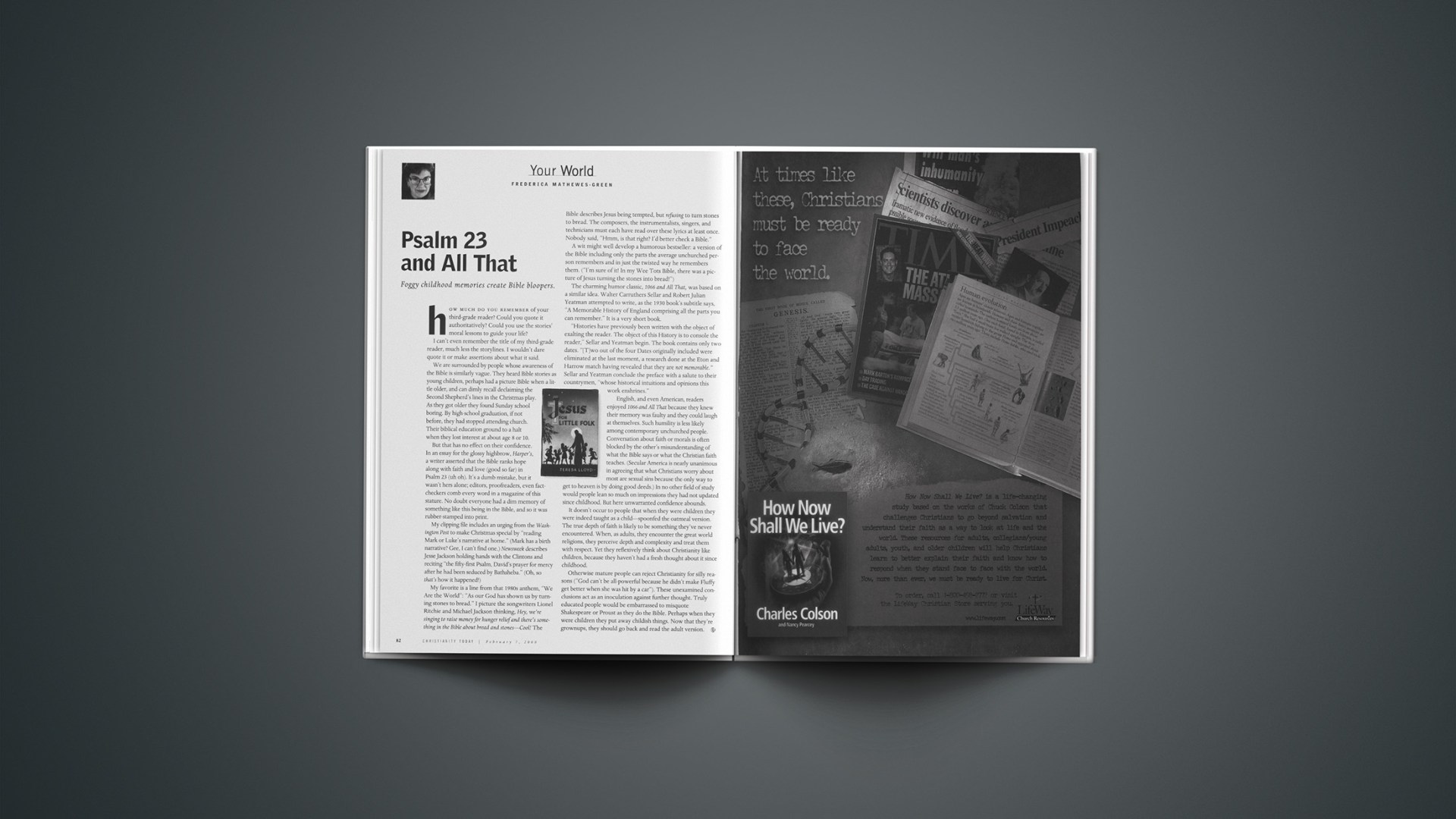 My clipping file includes an urging from the Washington Post to make Christmas special by “reading Mark or Luke’s narrative at home.” (Mark has a birth narrative? Gee, I can’t find one.) Newsweek describes Jesse Jackson holding hands with the Clintons and reciting “the fifty-first Psalm, David’s prayer for mercy after he had been seduced by Bathsheba.” (Oh, so that’s how it happened!)My favorite is a line from that 1980s anthem, “We Are the World”: “As our God has shown us by turning stones to bread.” I picture the songwriters Lionel Ritchie and Michael Jackson thinking, Hey, we’re singing to raise money for hunger relief and there’s something in the Bible about bread and stones—Cool! The Bible describes Jesus being tempted, but refusing to turn stones to bread. The composers, the instrumentalists, singers, and technicians must each have read over these lyrics at least once. Nobody said, “Hmm, is that right? I’d better check a Bible.”