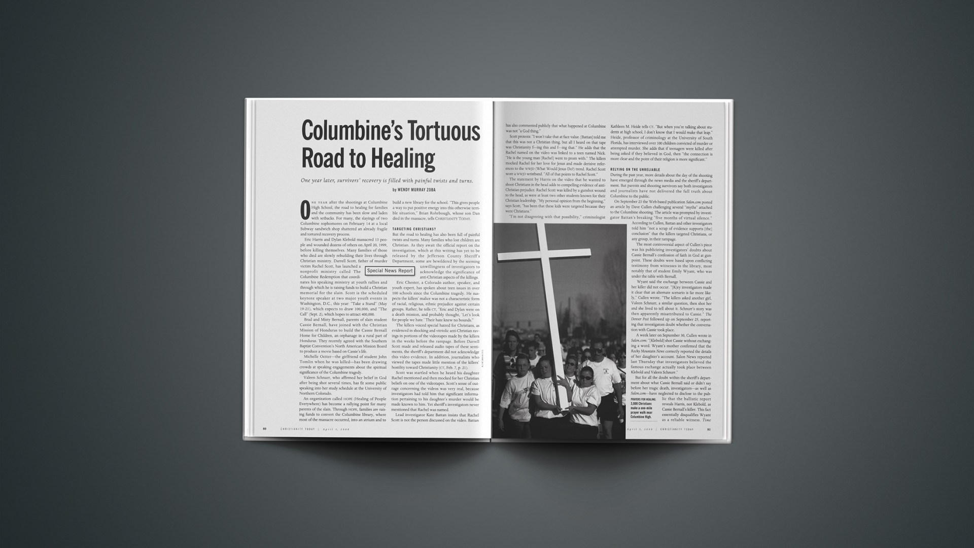 But the road to healing has also been full of painful twists and turns. Many families who lost children are Christian. As they await the official report on the investigation, which at this writing has yet to be released by the Jefferson County Sheriff's Department, some are bewildered by the seeming unwillingness of investigators to acknowledge the significance of anti-Christian aspects of the killings.