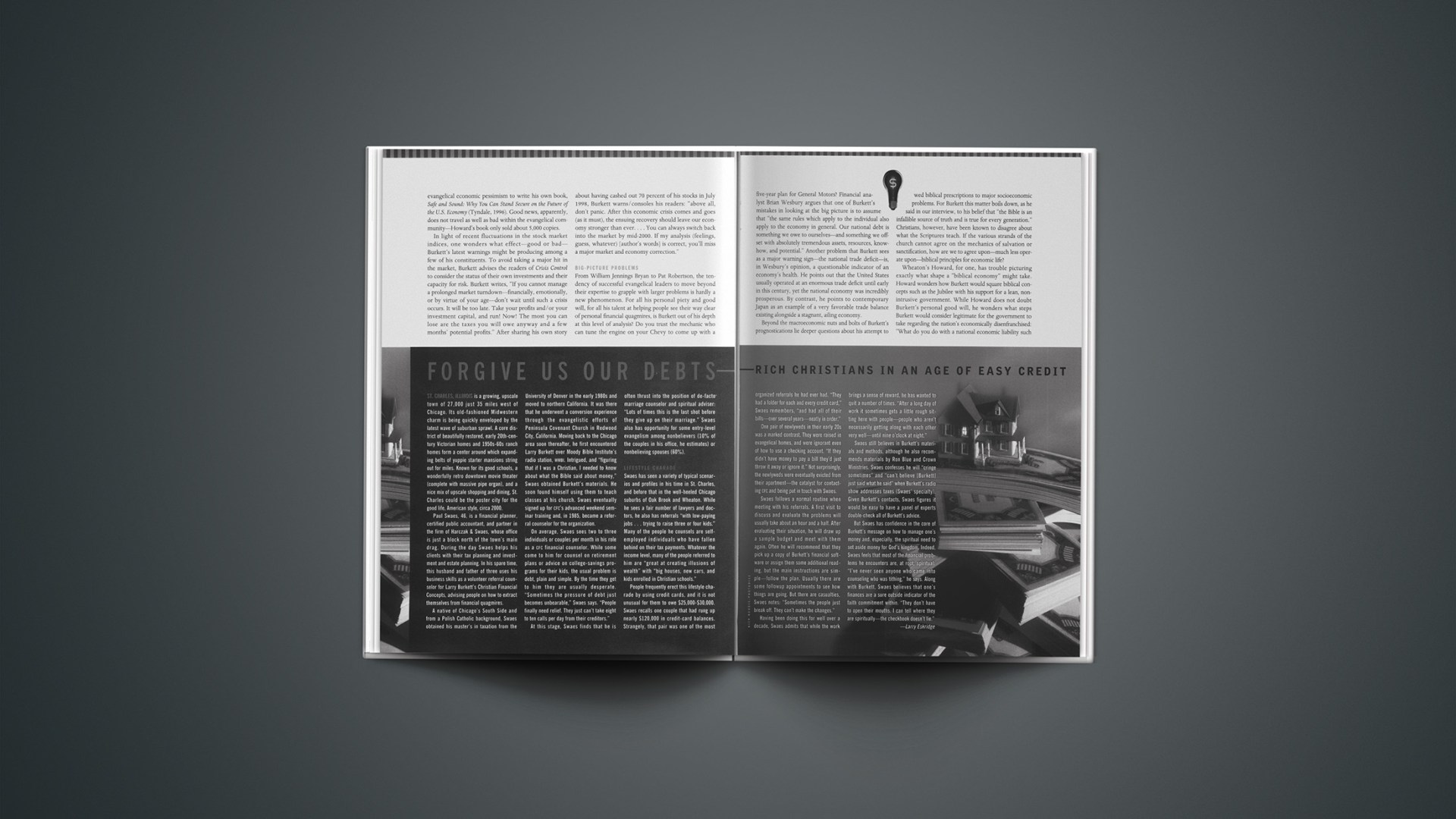 Swaes has seen a variety of typical scenarios and profiles in his time in St. Charles, and before that in the well-heeled Chicago suburbs of Oak Brook and Wheaton. While he sees a fair number of lawyers and doctors, he also has referrals “with low-paying jobs &#hellip; trying to raise three or four kids.” Many of the people he counsels are self-employed individuals who have fallen behind on their tax payments. Whatever the income level, many of the people referred to him are “great at creating illusions of wealth” with “big houses, new cars, and kids enrolled in Christian schools.”People frequently erect this lifestyle charade by using credit cards, and it is not unusual for them to owe $25,000-$30,000. Swaes recalls one couple that had rung up nearly $120,000 in credit-card balances. Strangely, that pair was one of the most organized referrals he had ever had. “They had a folder for each and every credit card,” Swaes remembers, “and had all of their bills—over several years—neatly in order.”One pair of newlyweds in their early 20s was a marked contrast. They were raised in evangelical homes, and were ignorant even of how to use a checking account. “If they didn’t have money to pay a bill they’d just throw it away or ignore it.” Not surprisingly, the newlyweds were eventually evicted from their apartment—the catalyst for contacting CFC and being put in touch with Swaes.Swaes follows a normal routine when meeting with his referrals. A first visit to discuss and evaluate the problems will usually take about an hour and a half. After evaluating their situation, he will draw up a sample budget and meet with them again. Often he will recommend that they pick up a copy of Burkett’s financial software or assign them some additional reading, but the main instructions are simple—follow the plan. Usually there are some followup appointments to see how things are going. But there are casualties, Swaes notes: “Sometimes the people just break off. They can’t make the changes.”Having been doing this for well over a decade, Swaes admits that while the work brings a sense of reward, he has wanted to quit a number of times. “After a long day of work it sometimes gets a little rough sitting here with people—people who aren’t necessarily getting along with each other very well—until nine o’clock at night.”Swaes still believes in Burkett’s materials and methods, although he also recommends materials by Ron Blue and Crown Ministries. Swaes confesses he will “cringe sometimes” and “can’t believe [Burkett] just said what he said” when Burkett’s radio show addresses taxes (Swaes’ specialty). Given Burkett’s contacts, Swaes figures it would be easy to have a panel of experts double-check all of Burkett’s advice.But Swaes has confidence in the core of Burkett’s message on how to manage one’s money and, especially, the spiritual need to set aside money for God’s kingdom. Indeed, Swaes feels that most of the financial problems he encounters are, at root, spiritual: “I’ve never seen anyone who came into counseling who was tithing,” he says. Along with Burkett, Swaes believes that one’s finances are a sure outside indicator of the faith commitment within. “They don’t have to open their mouths. I can tell where they are spiritually—the checkbook doesn’t lie.”